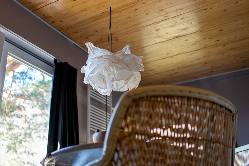 Le volume de la maison a été conçu par l'architecte Anita Tournour Viron avec l'idée de base d' envelopper comme une étreinte l'arbre centenaire au centre du terrain. Comme dans ses différents projets d'architecture, les matériaux de finition ont été soigneusement choisis pour exprimer la simplicité et l'essentiel. Le toit en tôle rappelle les tons du ciel pendant les tempêtes de printemps, tandis que les couleurs du crépi reflètent les nuances du gris tourterelle de l'écorce des pins et le vert des lichens qui recouvrent les roches autour de la maison.