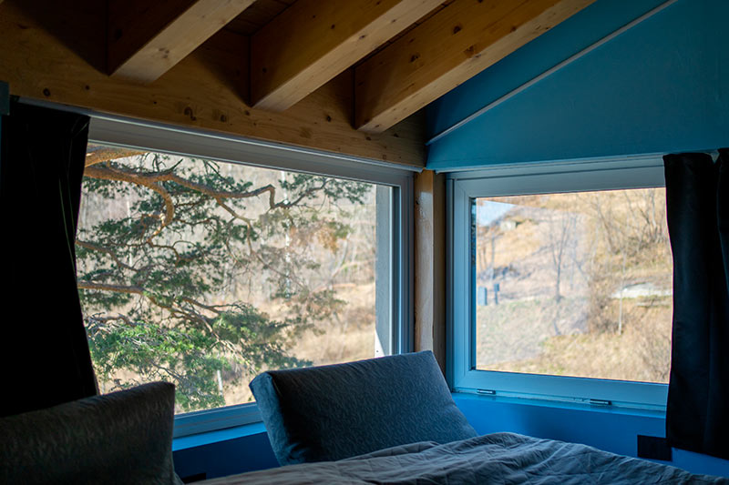 De grandes baies vitrées entourent le bâtiment, permettant au soleil de chauffer naturellement les espaces intérieurs même en hiver. Ces ouvertures favorisent une interaction visuelle continue entre l'intérieur et l'extérieur, avec le paysage changeant de couleurs au fil des saisons.