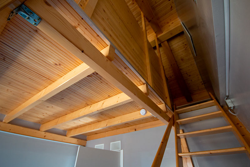 Les espaces intérieurs sont conçus pour assurer une flexibilité maximale. Initialement conçue comme une maison de vacances, la résidence est aujourd'hui devenue la résidence permanente de la famille. Les intérieurs privilégient l'utilisation de bois naturel, accompagné de tons clairs et neutres. Pour préserver la luminosité des pièces, il n'y a pas de volets, mais seulement des rideaux occultants.