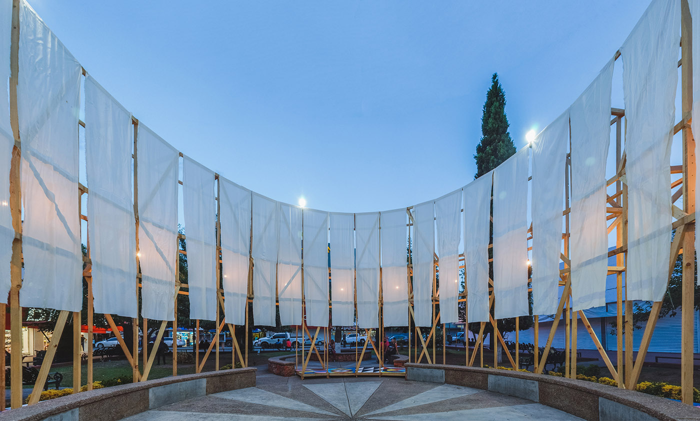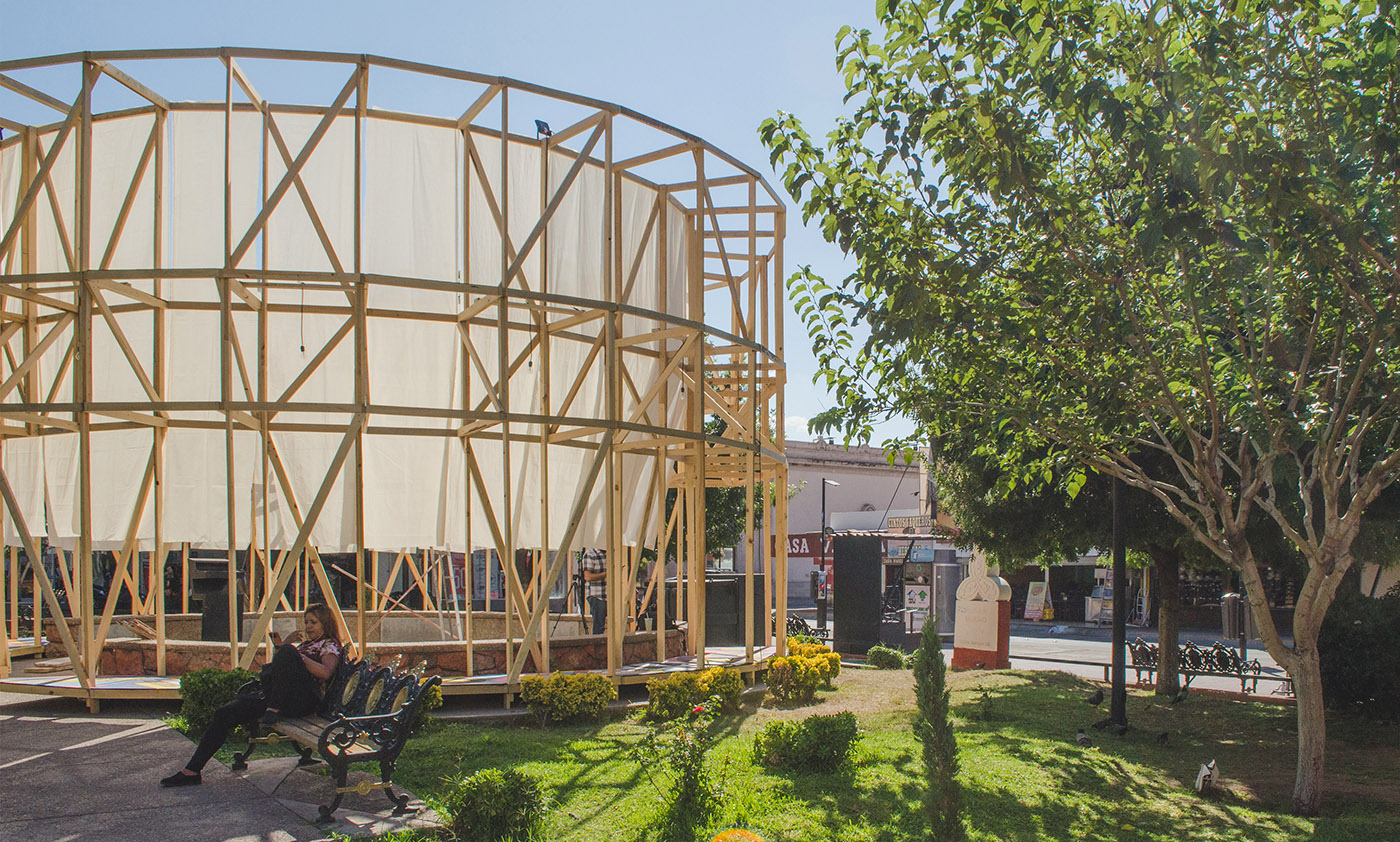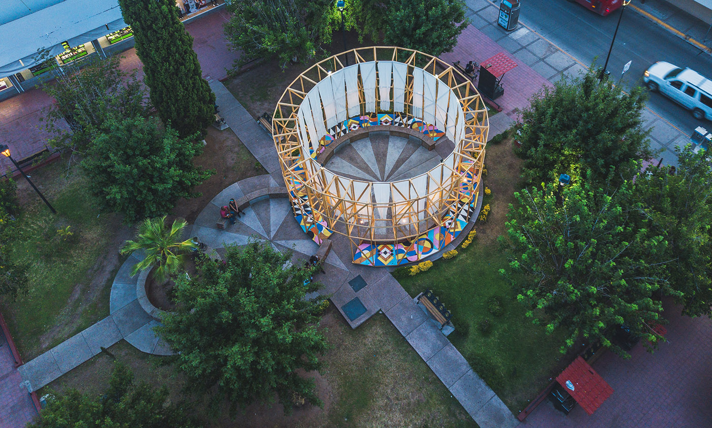 Située dans la place Merino, l'une des premières places du centre de la ville chilienne de Chihuahua datant de 1709, l'installation en bois appelée Antelia, par República Portátil, crée un espace pour se rencontrer et se protéger des températures extrêmes du lieu