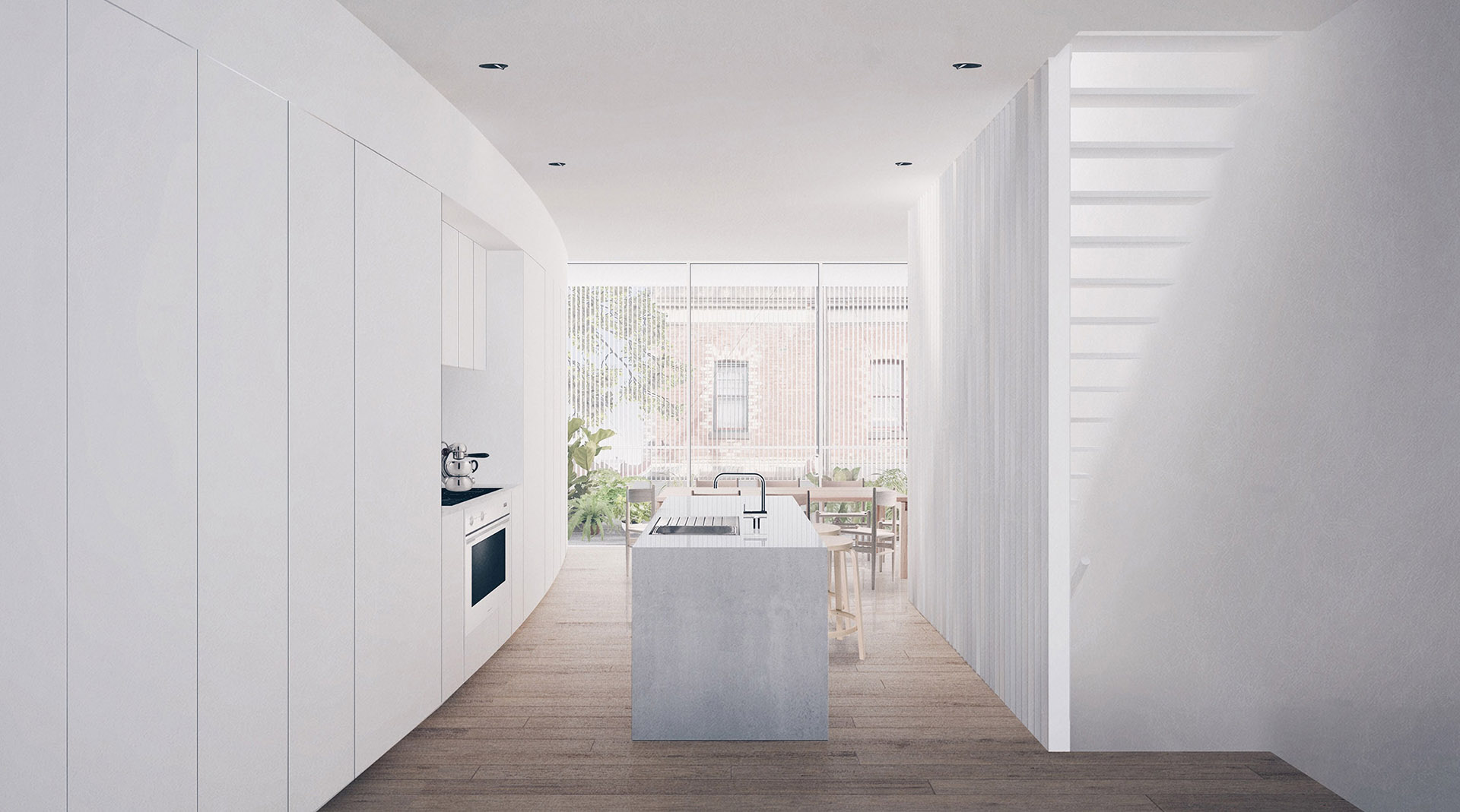 Vista la larghezza limitata del sito, gli elementi aggiunti sono estremamente funzionali e curvi per massimizzare lo spazio disponibile. Al piano terra, una sala curva offre un accesso alle camere da letto. Nella zona giorno centrale, una parete anch'essa curva ospita gli elettrodomestici, i vari servizi, massimizzando lo spazio del pavimento