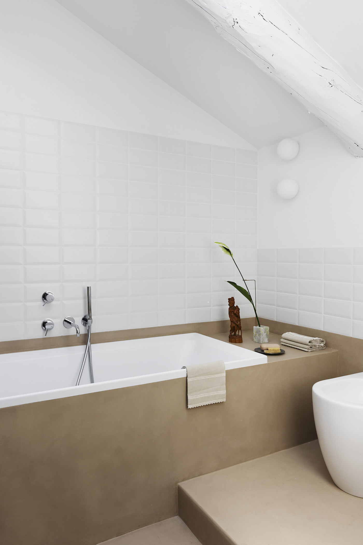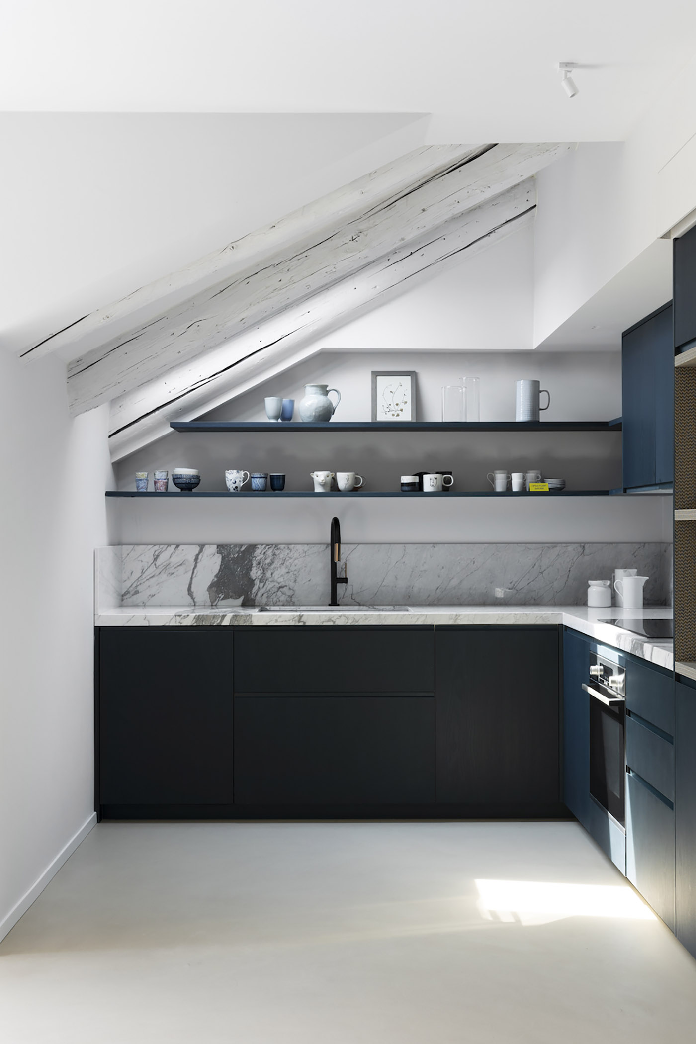 The renovation of the GN Apartment consists of the union and radical transformation of two attic rooms, which are connected into a single domestic space: here the constraints of a load-bearing masonry layout are resolved thanks to architectural solutions with a marked identity, maximum functionality and environmental comfort