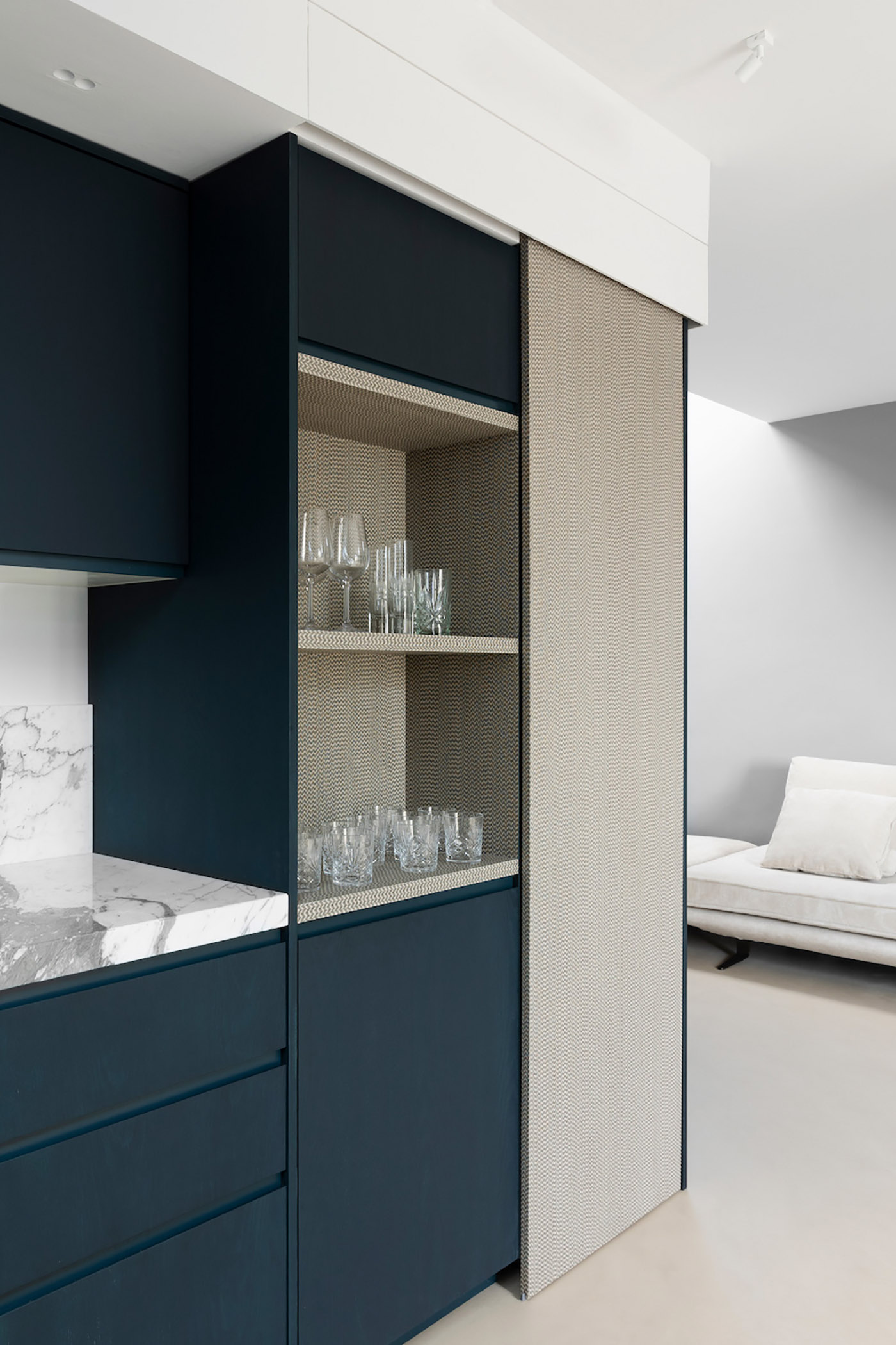 The living area of the GN Apartment consists of the living area and the kitchen, this one entirely made to design: the top with integrated sink is made of Carrara marble, characterized by a macroscopic vein running all along the top; the doors are made of ultramarine blue-stained ash wood, while a sliding door covered in fabric-effect Day and Night Twill veneer from the Alpi brand, designed by Matteo Ragni, hides the refrigerator