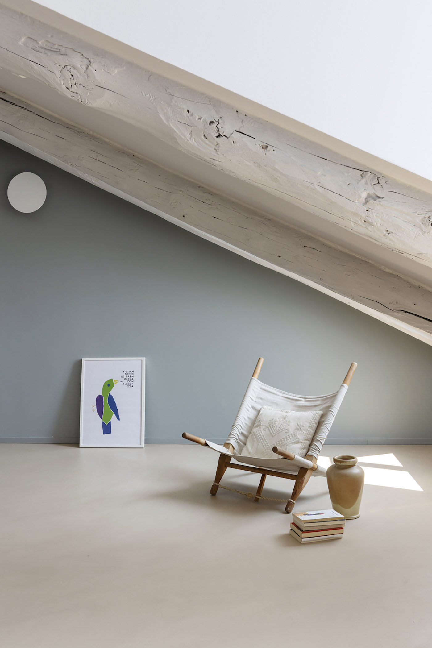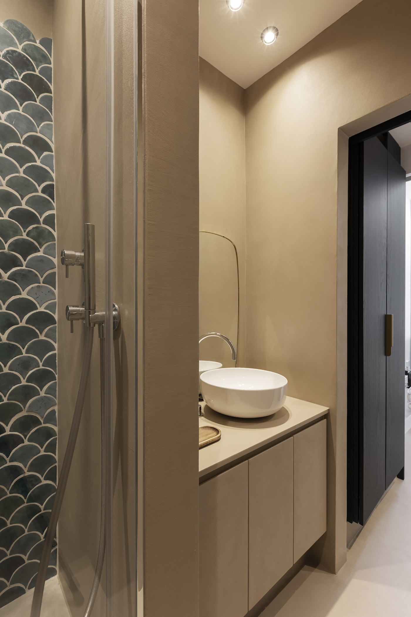The table is illuminated by OliveLab's L02 hanging lamp, and a circular light well was also created in the ceiling to increase natural lighting. A second sliding door gives access to the small laundry room and a service bathroom entirely clad in resin with an immersive textural effect