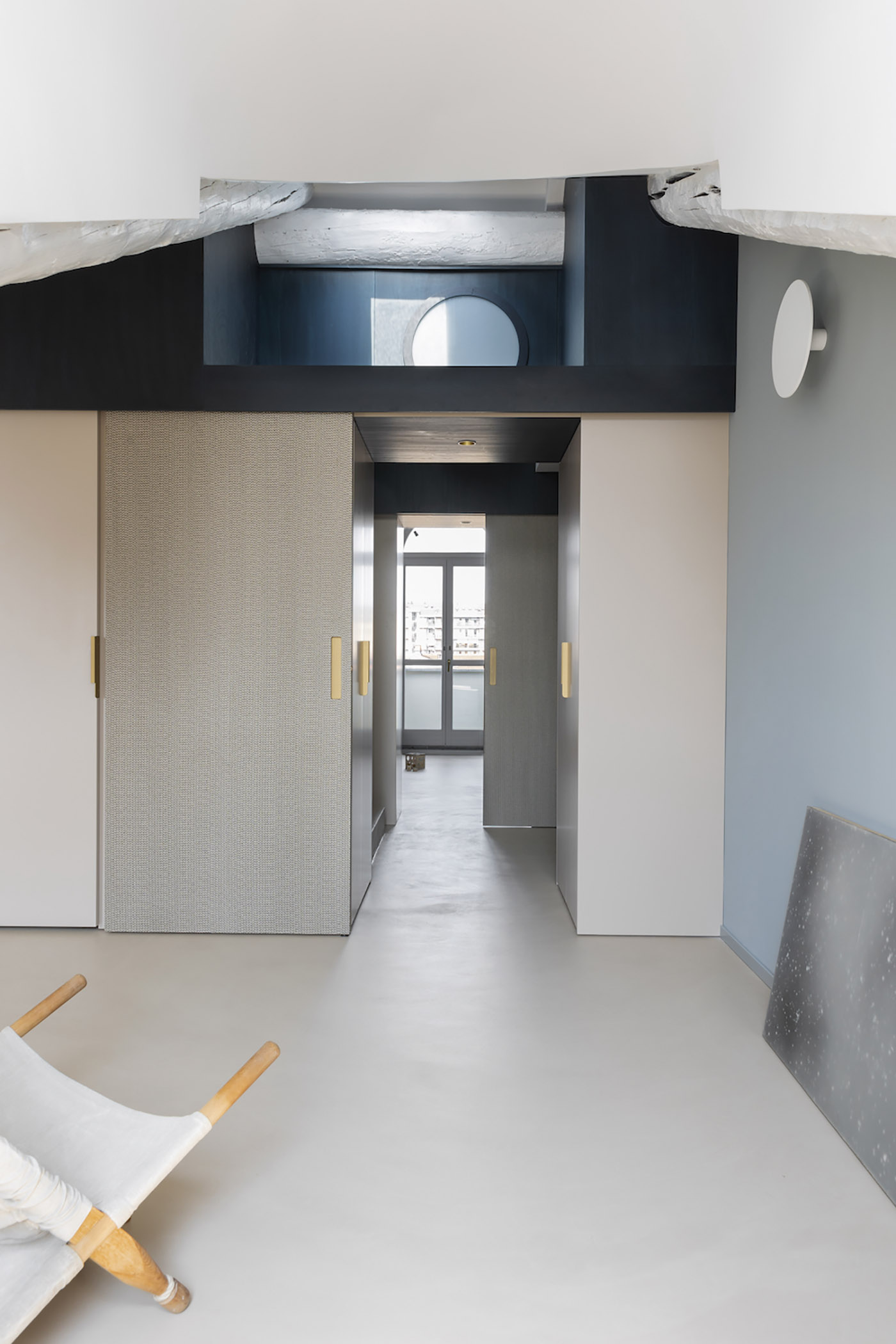 From the hallway created through partitions consisting of fixed furnishings useful for creating precious container-volumes, access is gained to the master bathroom and the two bedrooms: in the former, Birds N Bees wallpaper by Timorous Beasties gives the space a playful note, emphasized by the presence of the Lita blown-glass spherical wall sconces by Luceplan. The perimeter of both bedrooms consists of full-height lacquered wood closets made according to an ad hoc design that goes into the smallest detail, down to the conception of the handle