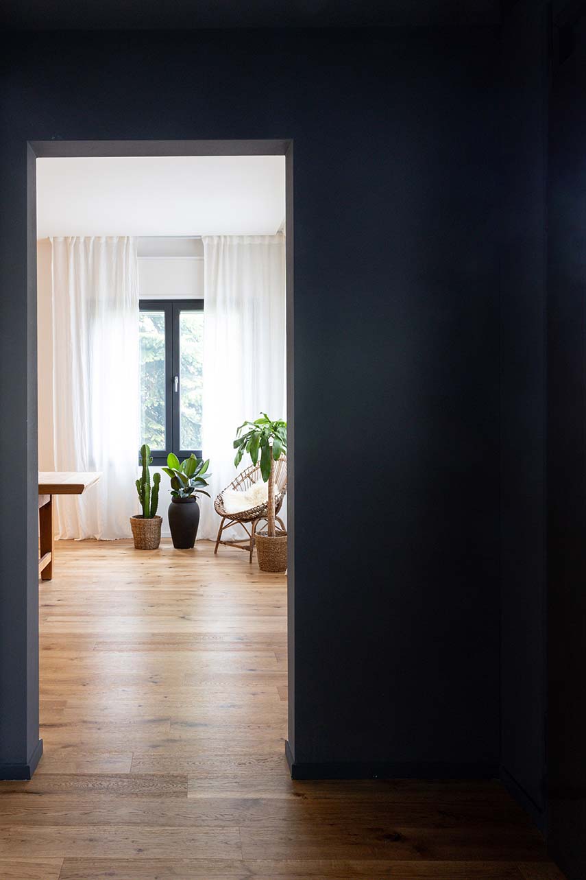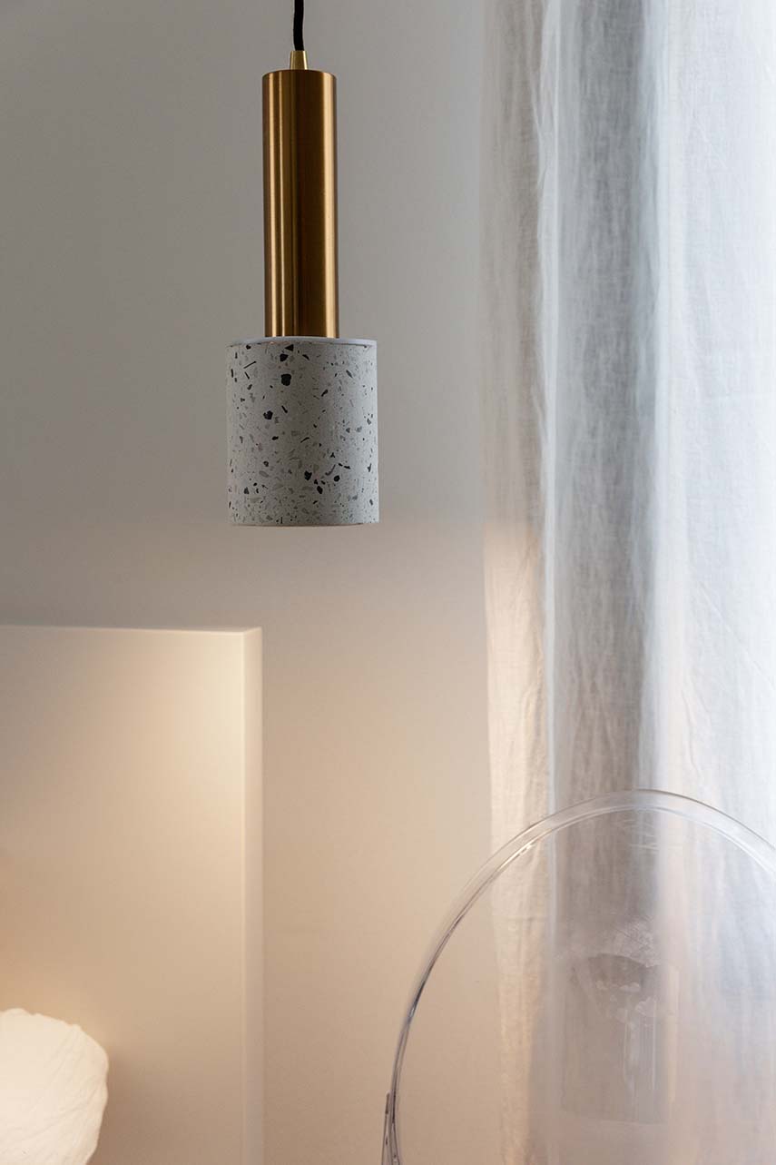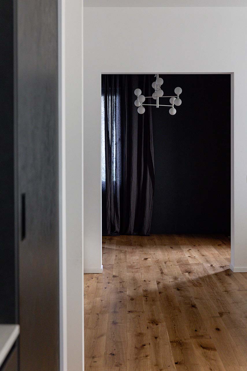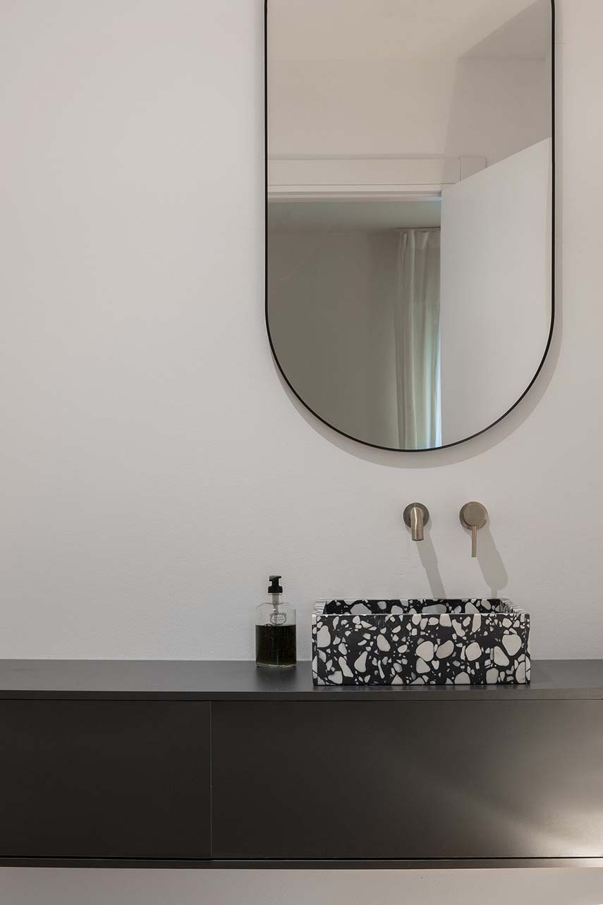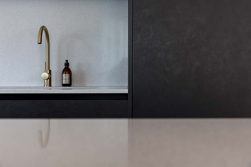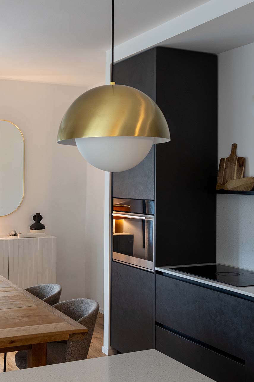 La cuisine est l'un des éléments phares de la maison, enrichie d'une atmosphère moderne. Dotée d'un îlot central avec un plan en marbre aggloméré, elle offre un contraste élégant avec les éléments de cuisine noirs à l'effet béton. Cette combinaison de matériaux confère à la cuisine une élégance raffinée et en même temps accueillante.