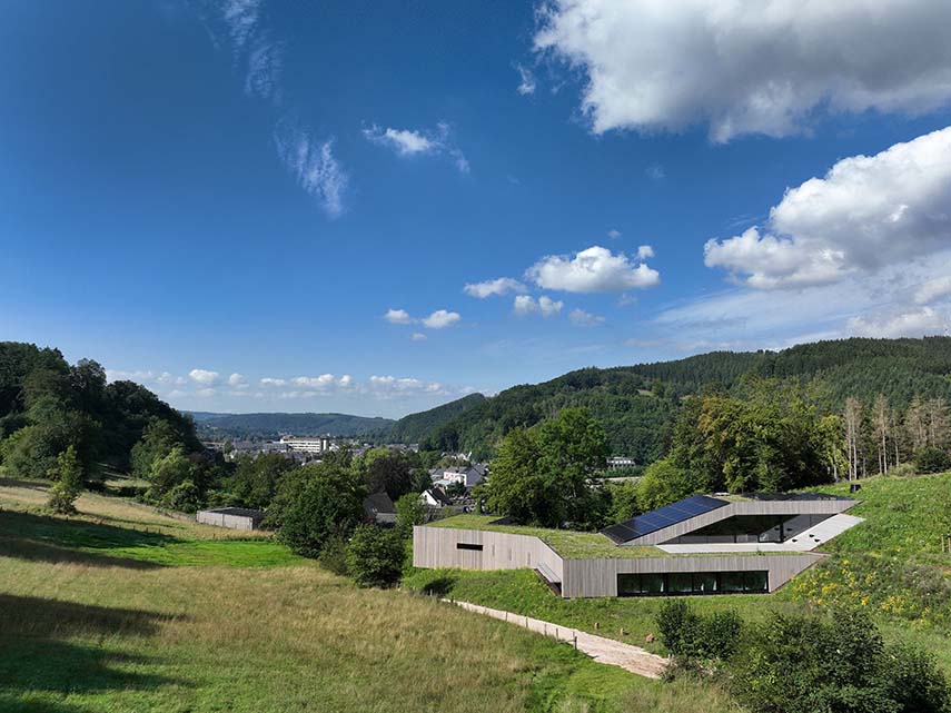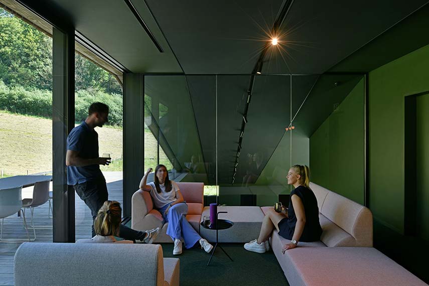 Le projet du siège de crahayjamaigne naît à la frontière entre urbanisation et nature, à un point où la ville se retire et laisse place à la végétation. Le volume, de forme fluide et organique, s'insinue dans le sol, disparaît dans la colline et se laisse traverser par le paysage. L'accès, discret, est obtenu par une coupe dans la pente menant à l'entrée couverte et au parking souterrain.