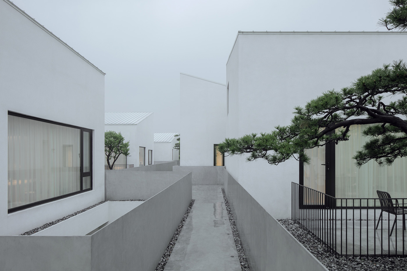 The choice of materials for both architecture and interior responds to the concept and spatial strategy: the designers choose different materials for each level to create a different atmosphere. The ground floor façade features laminated bamboo, which respectfully blends in with its surroundings while providing a warm and relaxing feeling with a soft touch, while pure white lends a sense of simplicity and cleanliness