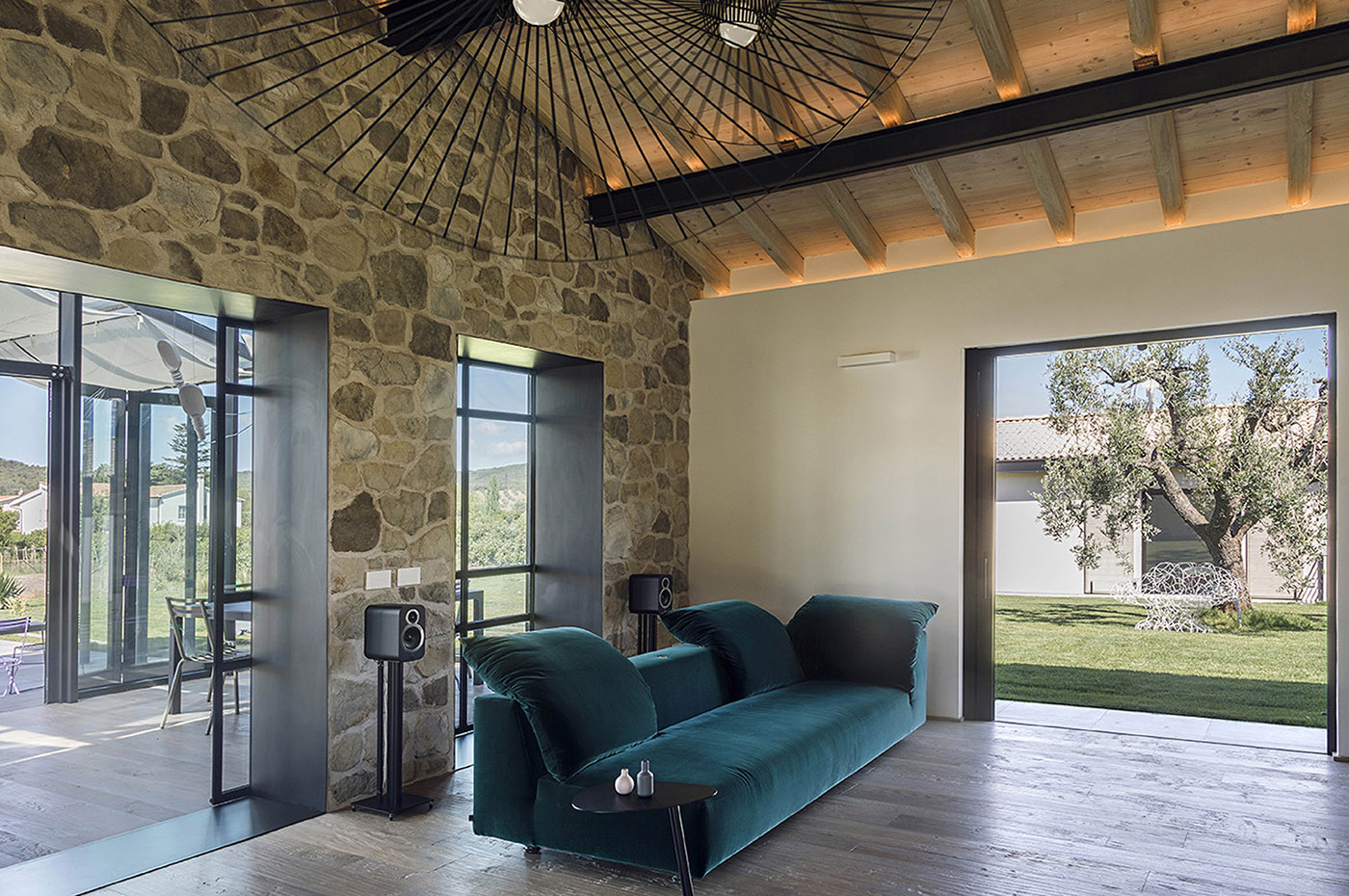 Un gioco di contrasti con le tonalità e la modernità degli arredi e degli elementi architettonici, come il tetto in legno e travi a vista in acciaio e il pavimento in rovere. La sensazione che avvertiamo in questo moderno “fienile”, “nato come un fiore”, è che il concetto di interno ed esterno non esista. Paesaggio e architettura sono protagonisti di un perfetto equilibrio tra natura e design.