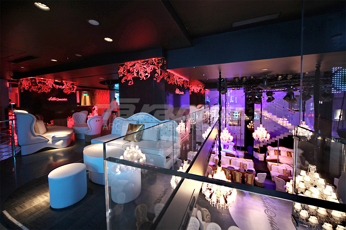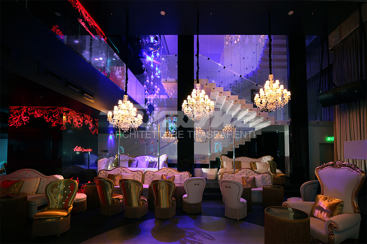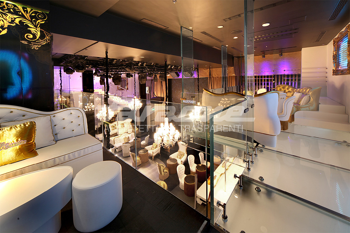 Uno spazio in cui, colori, riflessi e trasparenze si fondono per creare un ambiente magico. La pulizia estetica del vetro in contrasto con un stile d’ arredamento che punta su dettagli opulenti e lussuosi, offre alla clientela una location esclusiva dallo stile elegante.