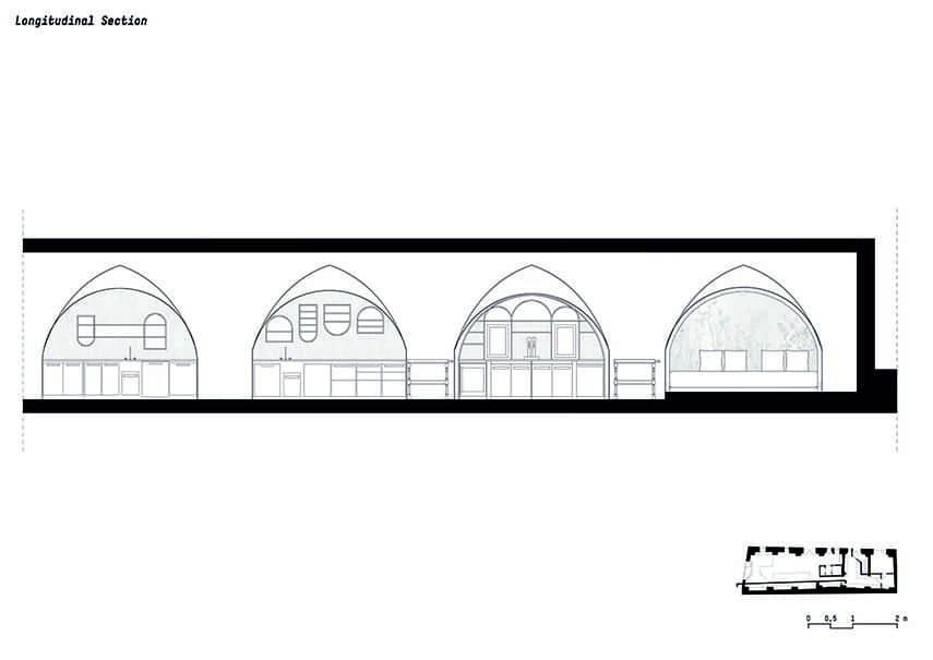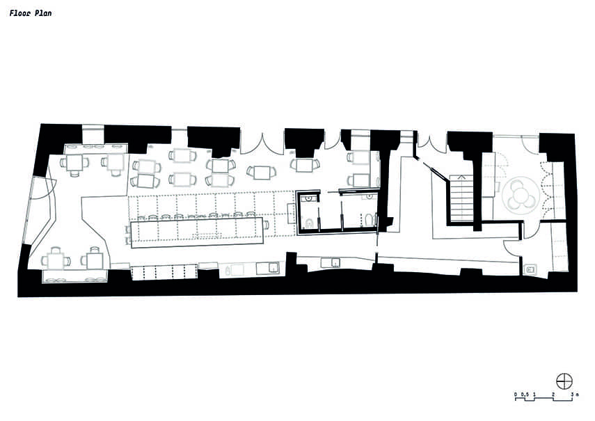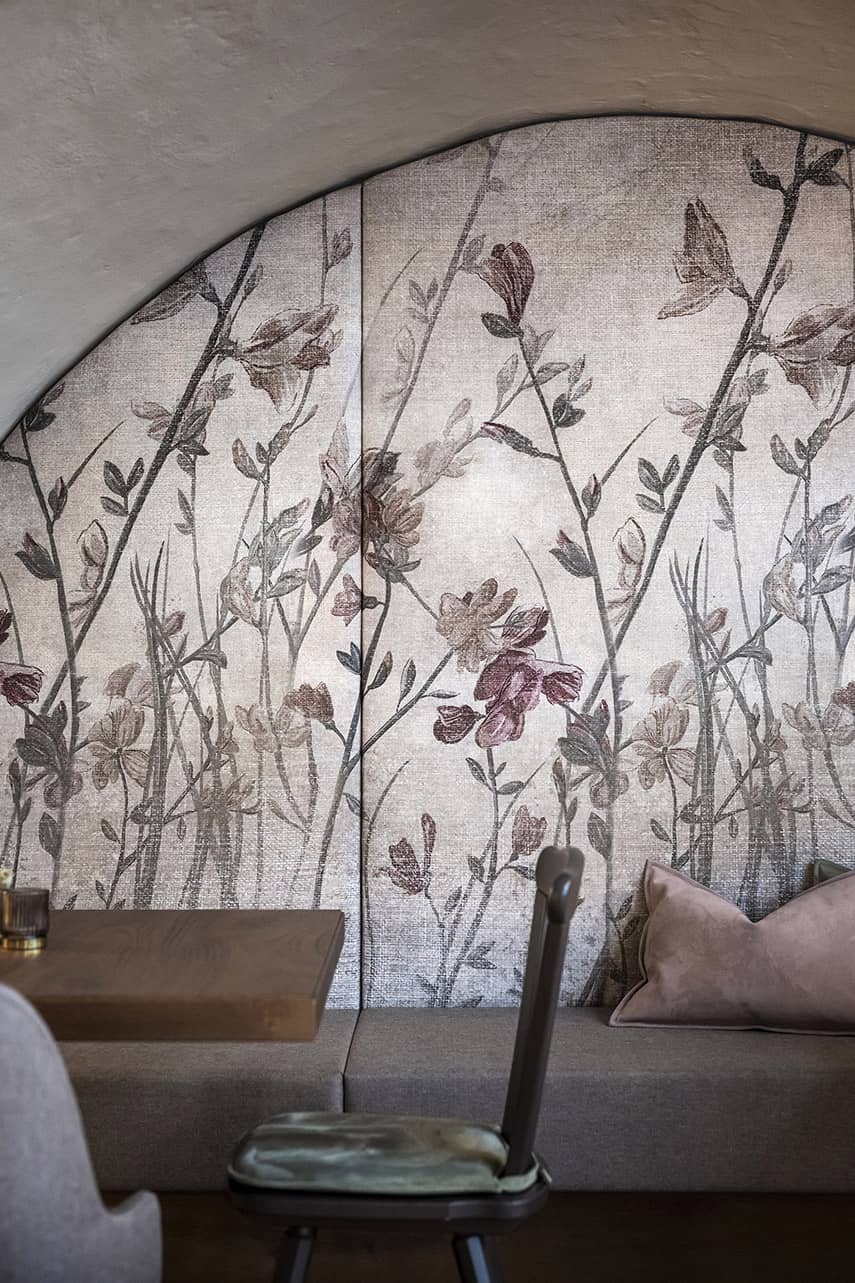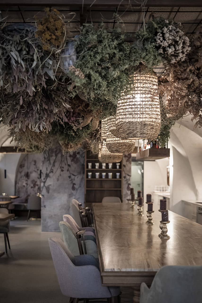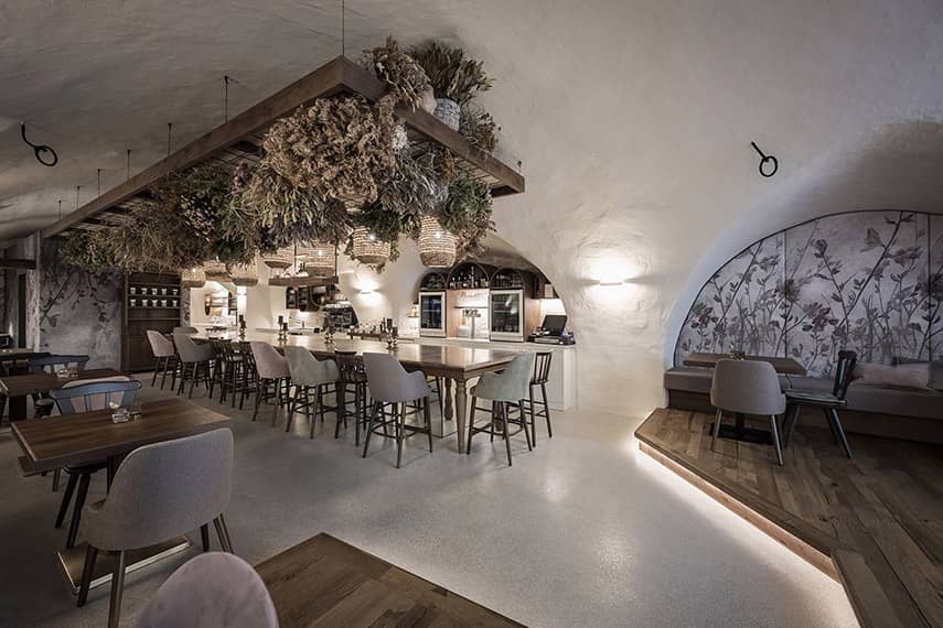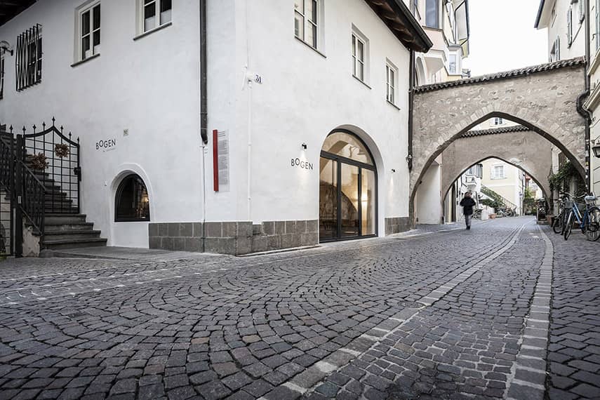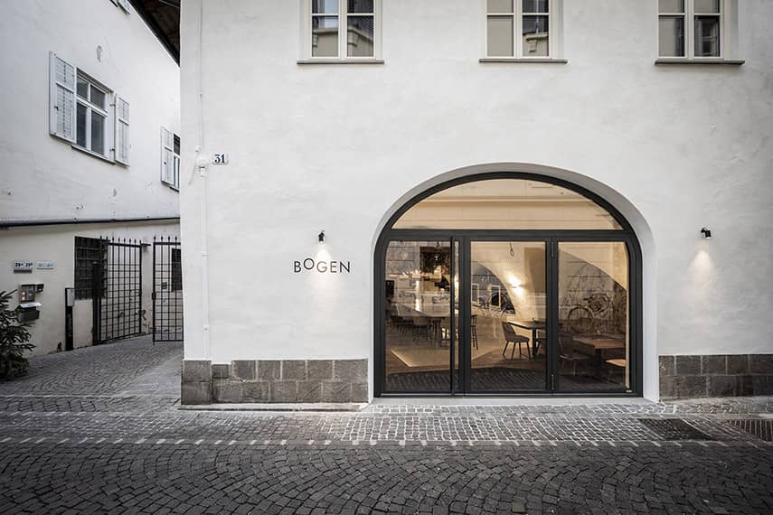 La famille Mayr, actuelle propriétaire du bâtiment, a confié à l'agence noa* - network of architecture la tâche de restaurer la partie historique du bâtiment et de concevoir la nouvelle destination : le bistrot Bogen. En concevant l'intérieur du lieu, l'attention s'est portée sur les quatre arcs qui, de chaque côté, rythment les presque 19 mètres de profondeur de l'espace. Avec le désir des clients de créer une ambiance romantique et bohémienne, associé au savoir-faire artisanal de Roswitha Mayr, la maîtresse de maison, qui a souhaité apporter une touche personnelle à l'atmosphère, noa* a façonné le design autour de ces éléments distinctifs.