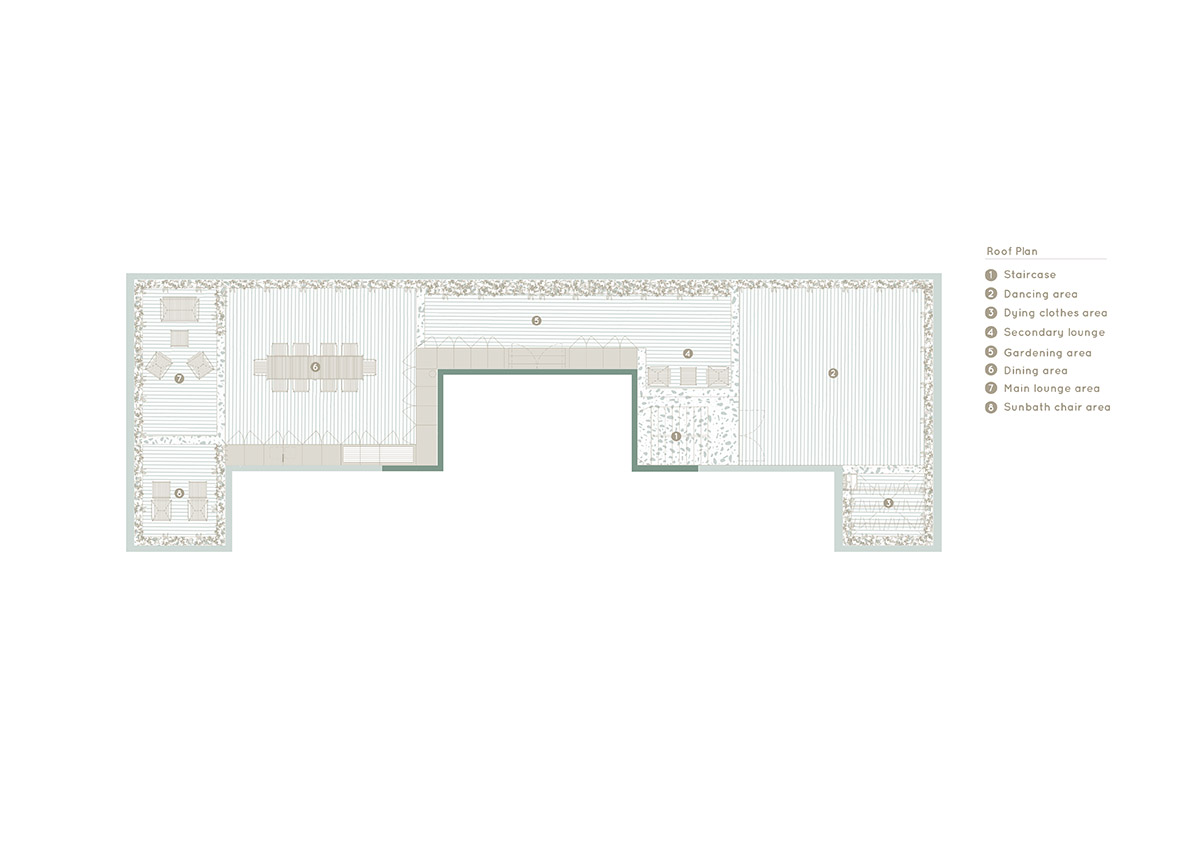 Each "generation" occupies a designated part of the house, but with common meeting places located either in the heart of the apartment or on the rooftop terrace. Therefore, the areas where they are connected together served as the backbone that shaped the design and layout. The private areas were conceptualized as studios within a house' for a sense of privacy between users