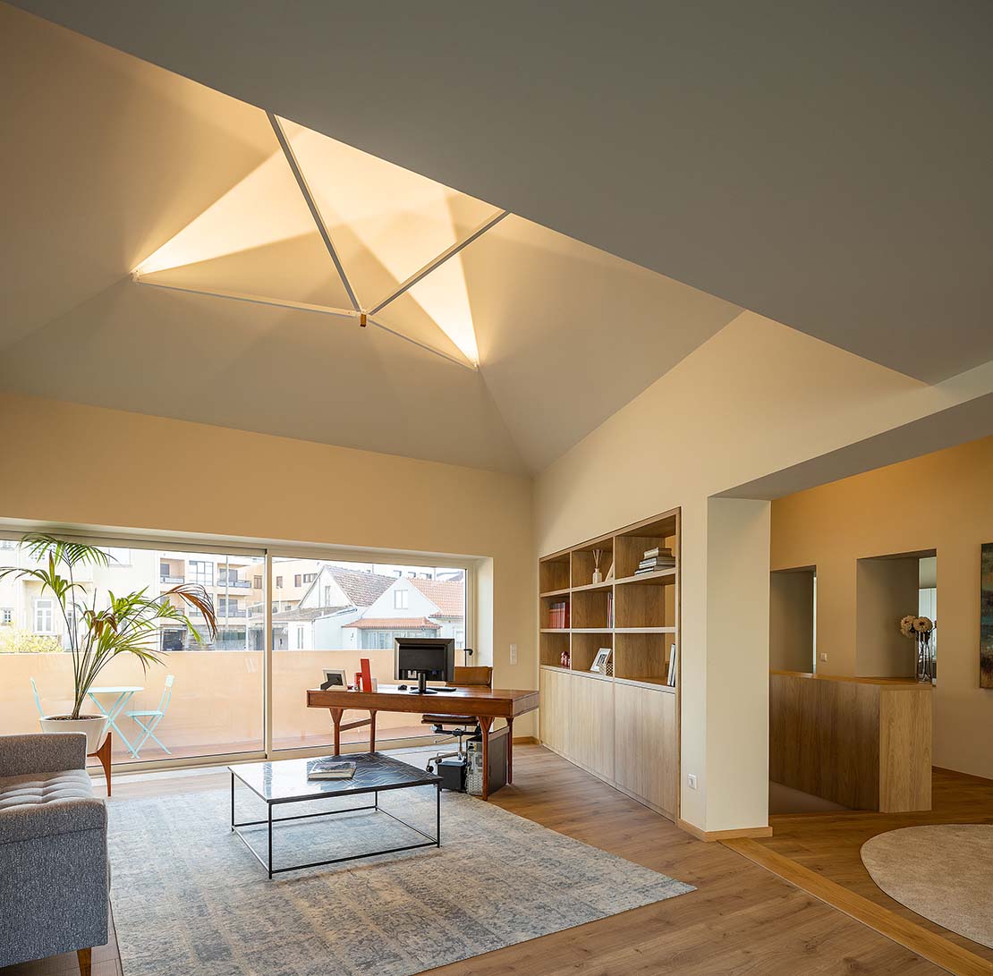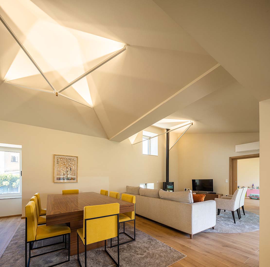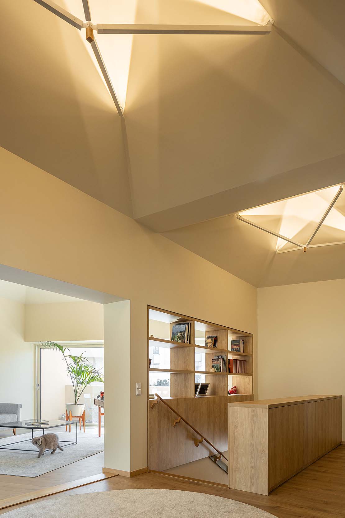 Le toit du volume qui abrite la zone de vie a été conçu suivant une composition en forme de 'parapluies' qui délimitent doucement chaque espace tout en les maintenant connectés dans un seul grand environnement. L'éclairage indirect renforce cette idée et transmet un sentiment de bien-être