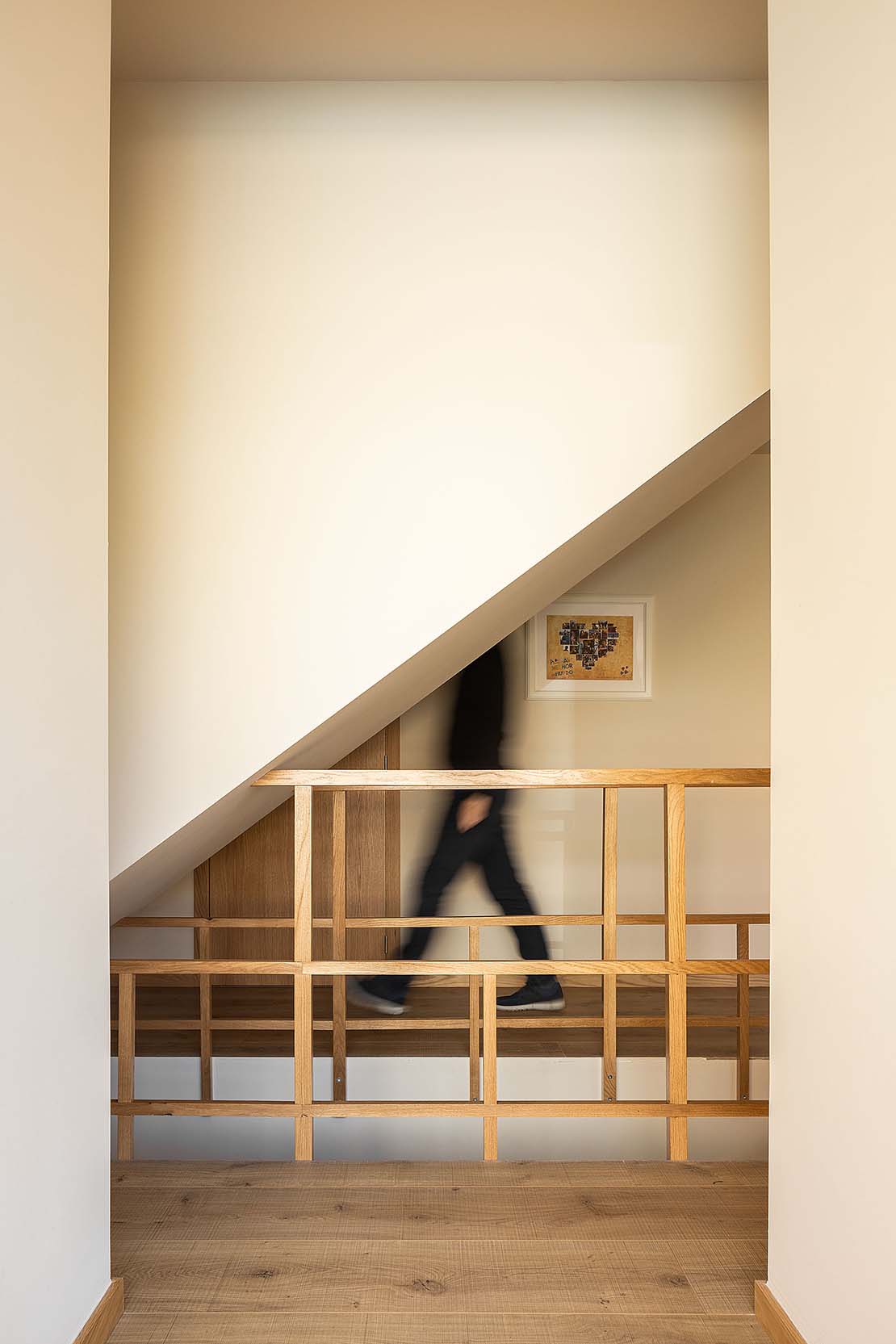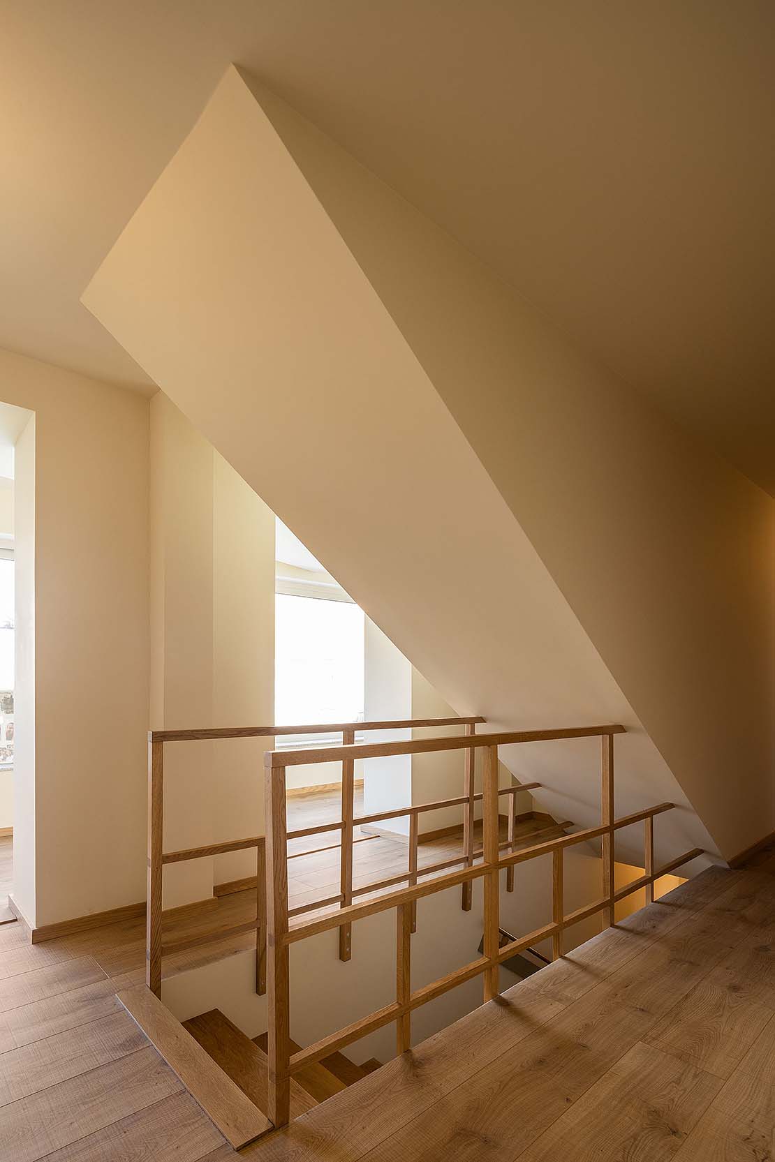 La différence entre les espaces communs et les espaces privés est mise en évidence par la définition des volumes et par le design d'intérieur. L'espace commun, qui comprend la cuisine, le salon et une salle polyvalente, est réparti sur un seul plan ouvert ; les espaces privés, composés des chambres et des salles de bains, se trouvent dans une tour indépendante de trois étages, reliée aux autres espaces par un couloir