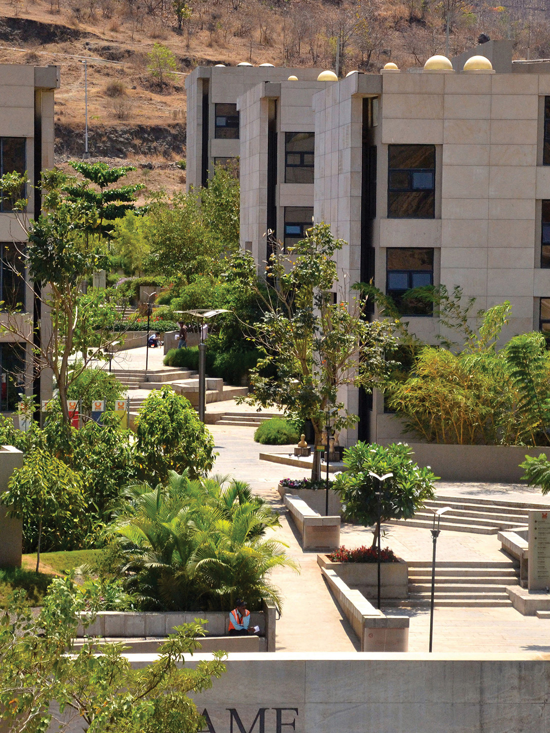On entre dans une structure par une porte dans le sens traditionnel des wadas de Pune. Ces entrées servent de blocs de service pour les structures à l'intérieur. À l'extrémité sud, la colonne vertébrale se termine par un amphithéâtre, qui coupe le bâtiment de l'administration et des services aux étudiants et relie aux collines environnantes