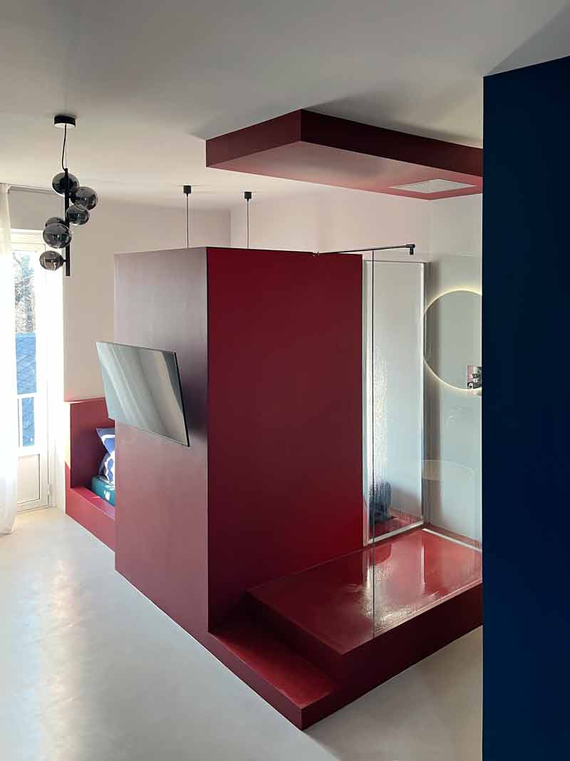 Le rouge et le bleu : les couleurs primaires teintent deux objets sur un plan aseptique, donnant à l'environnement un aspect moderne et essentiel. Le bloc rouge contient le lit, son conteneur spécialement conçu pour les draps, et la douche à l'italienne accessible à la fois depuis le salon et depuis le fond du lit. Le bloc bleu, quant à lui, dissimule les installations de chauffage et de refroidissement, les émanations de vapeurs et d'odeurs, la salle de bain et les anciennes gaines, récupérées et mises aux normes.