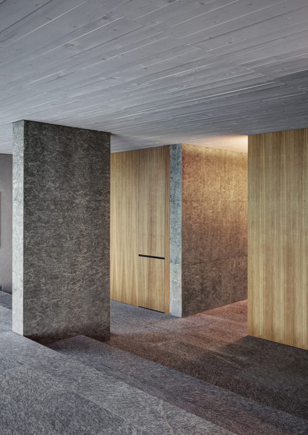 Partiture in cemento armato faccia a vista con finitura ottenuta tramite l’utilizzo di pannelli di legno pressato tipo osb costruiscono gli spazi sottratti al pendio naturale (patii e cortili)