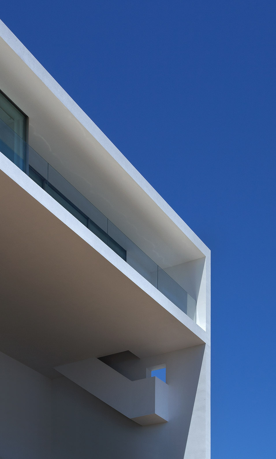 Its monolithic form and strong geometries seem to be in contrast with the territory, but this architecture manages to give serenity because of its complete white, its blue reflection and the desire for a holiday that it arouses.