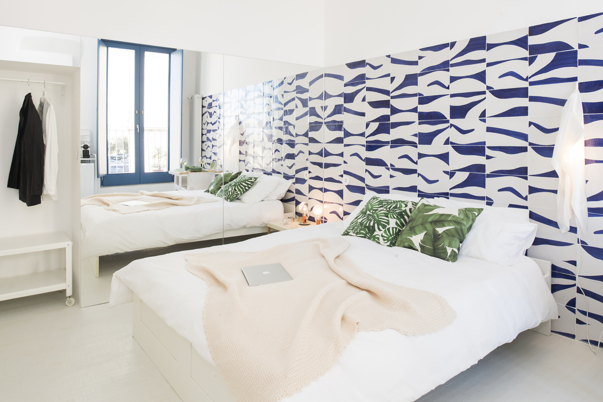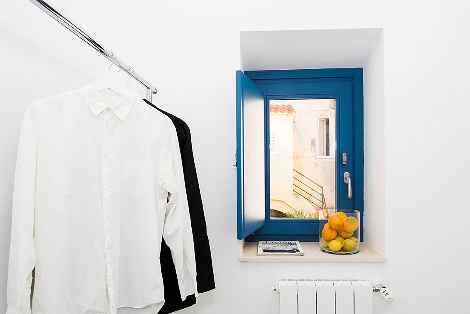 Tout ce qu'il contient est une boîte blanche, tandis que les matériaux choisis rappellent la mer et sa couleur constamment changeante. La palette de matériaux crée une matérialité polychrome bleue, qui vibre lorsqu'elle est exposée à une lumière naturelle intense. Même les meubles sont en contraste avec cette boîte, mais toujours en harmonie avec la couleur de la maison