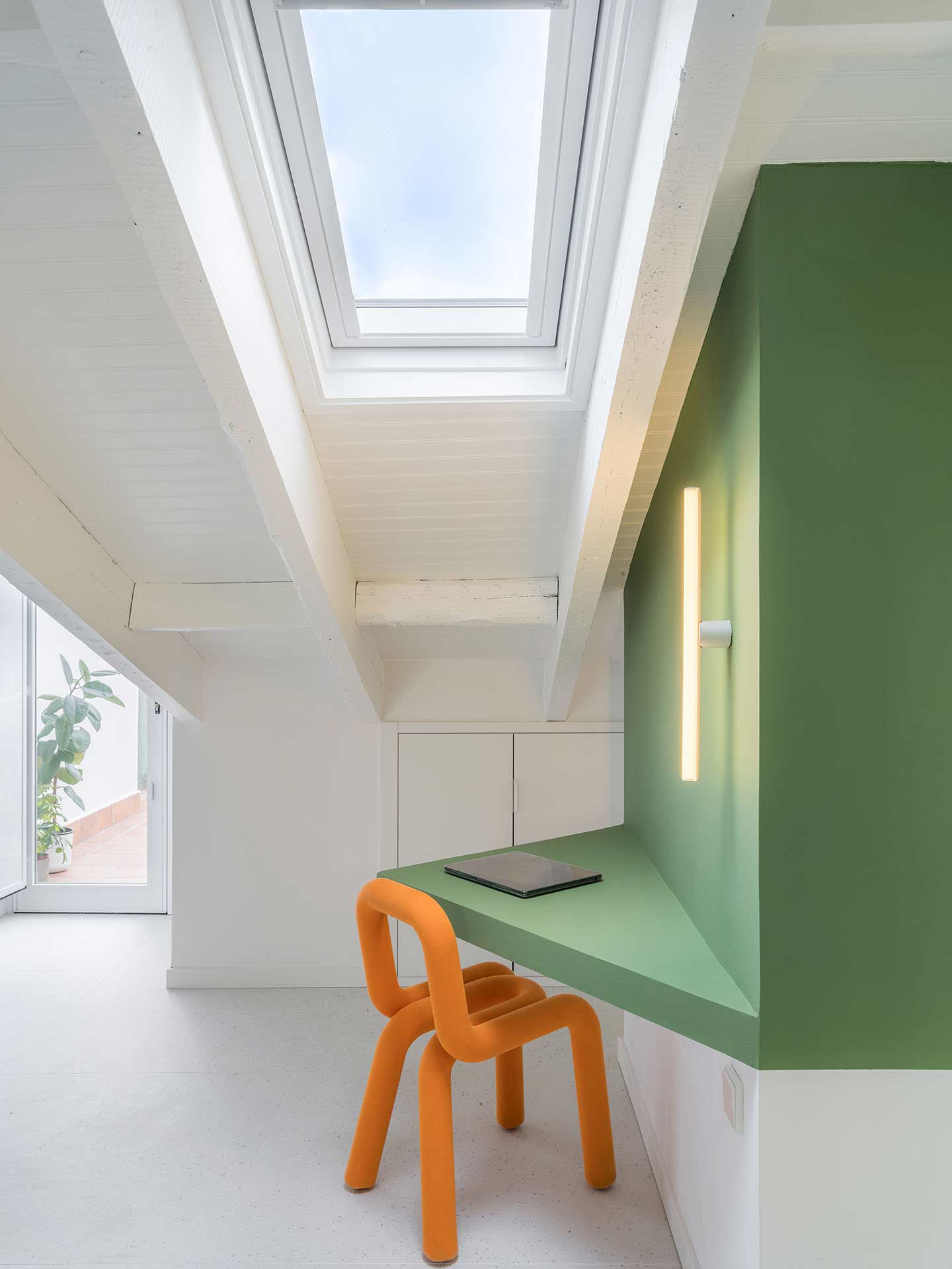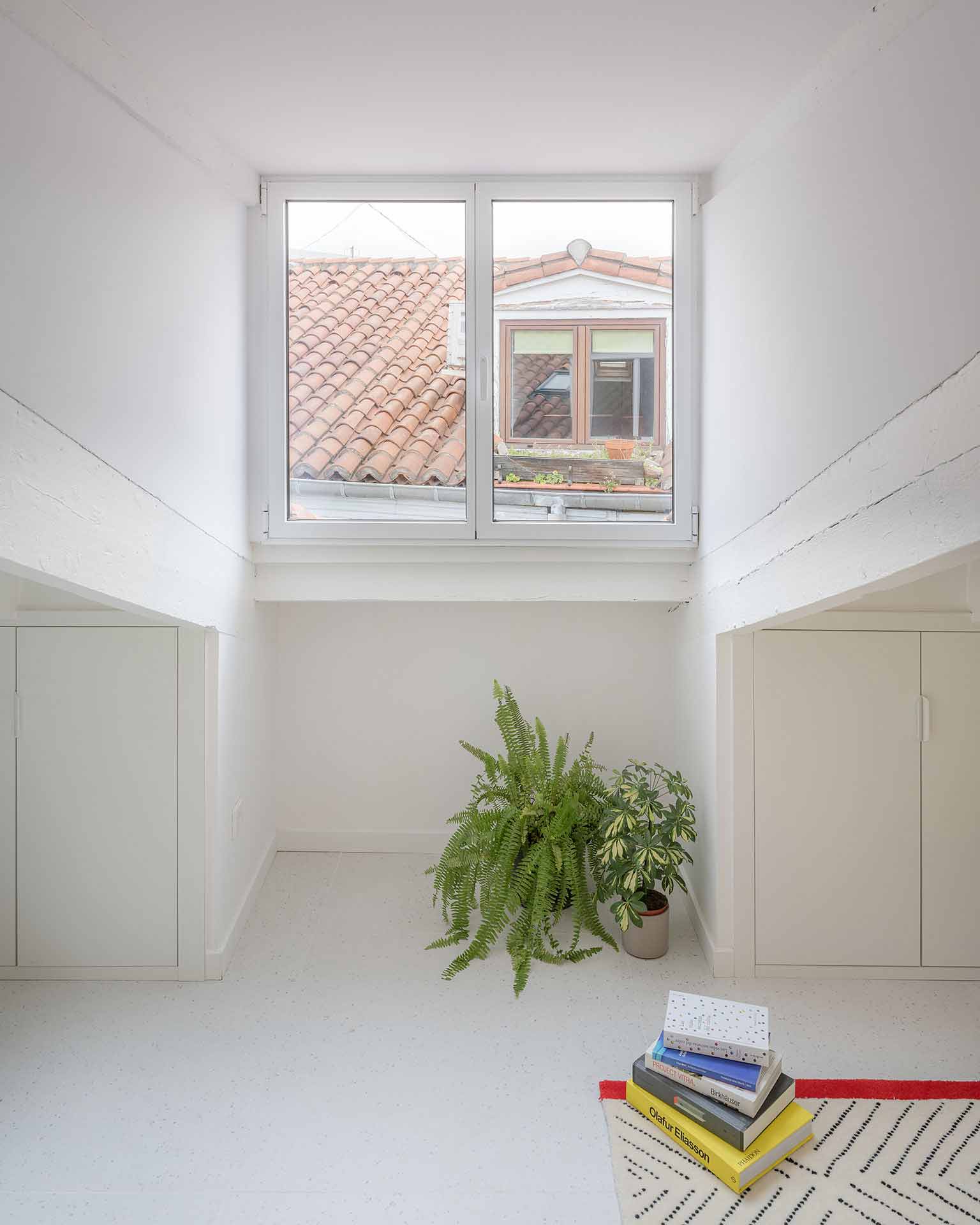 Au centre des villes, les buhardillas - les mansardes - sont souvent perçues comme des lieux suspendus, des espaces recueillis flottant au-dessus des toits. Des environnements difficilement accessibles, cachés à la vue et donc chargés d'un charme ample mais avec des hauteurs variables et des murs peu définis : un terrain idéal pour expérimenter de nouvelles formes d'habitation. C'est dans ce contexte que naît Casa Flix, du cabinet spécialisé dans les projets de design d'intérieur gon architects, située au dernier étage d'un immeuble de 1900, à quelques pas de la Plaza de Callao, au coeur vibrant de Madrid.