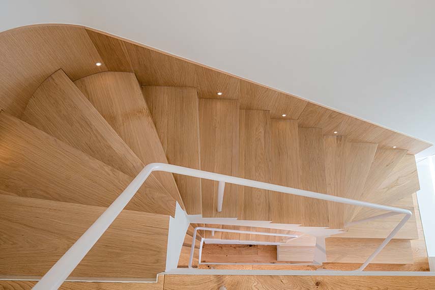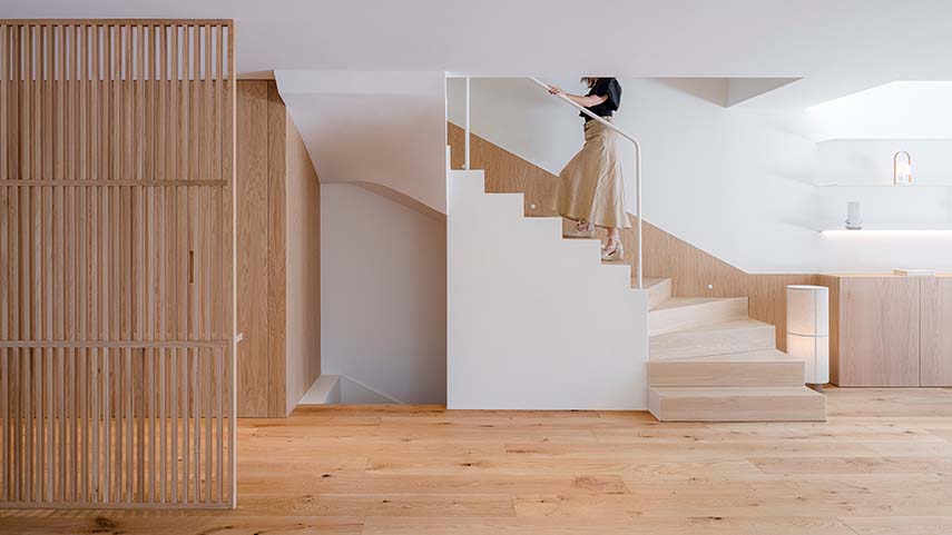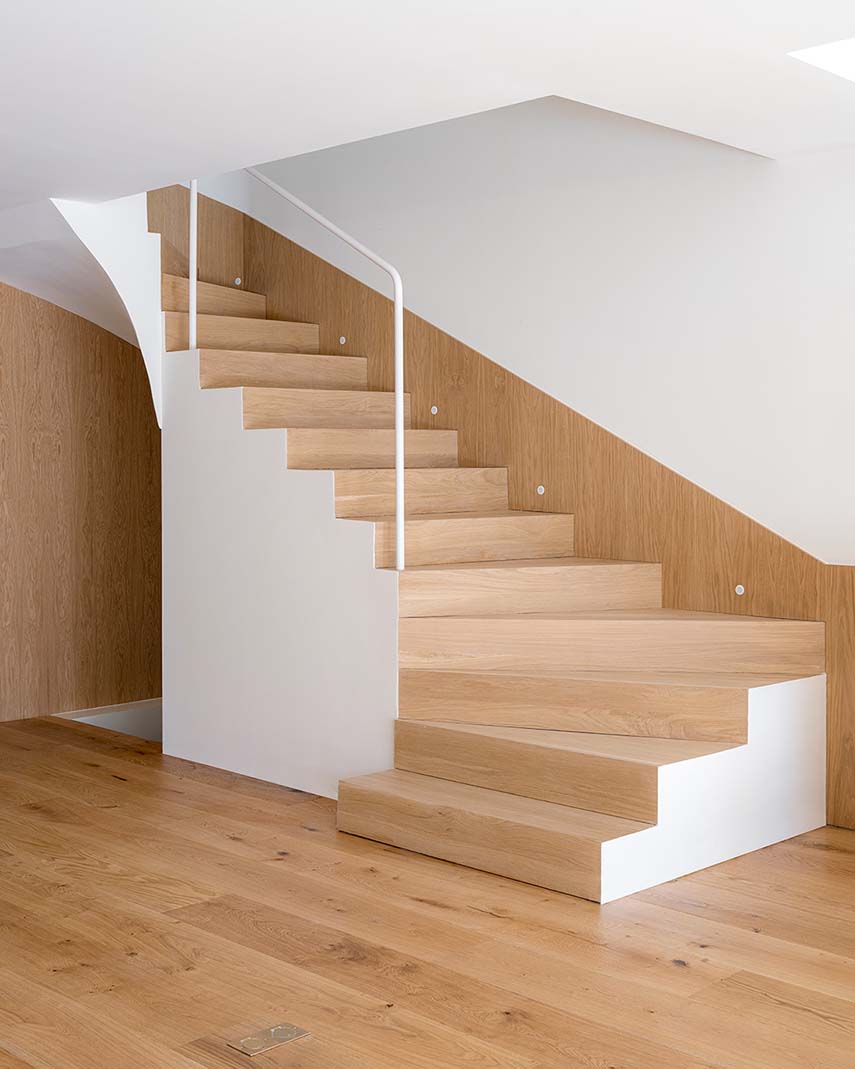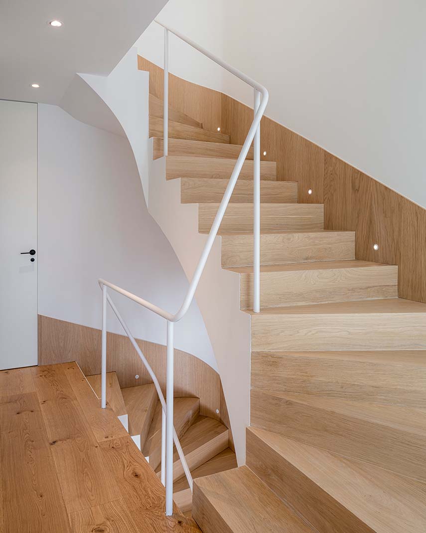 En créant une ouverture intérieure, conçue comme une lanterne, les trois étages qui abritent l'espace de vie, l'espace nuit et le bureau, sont reliés entre eux. Cette soustraction volumétrique permet un éclairage plus profond du rez-de-chaussée, en connectant visuellement, tant en hauteur qu'horizontalement avec l'extérieur, les différents espaces