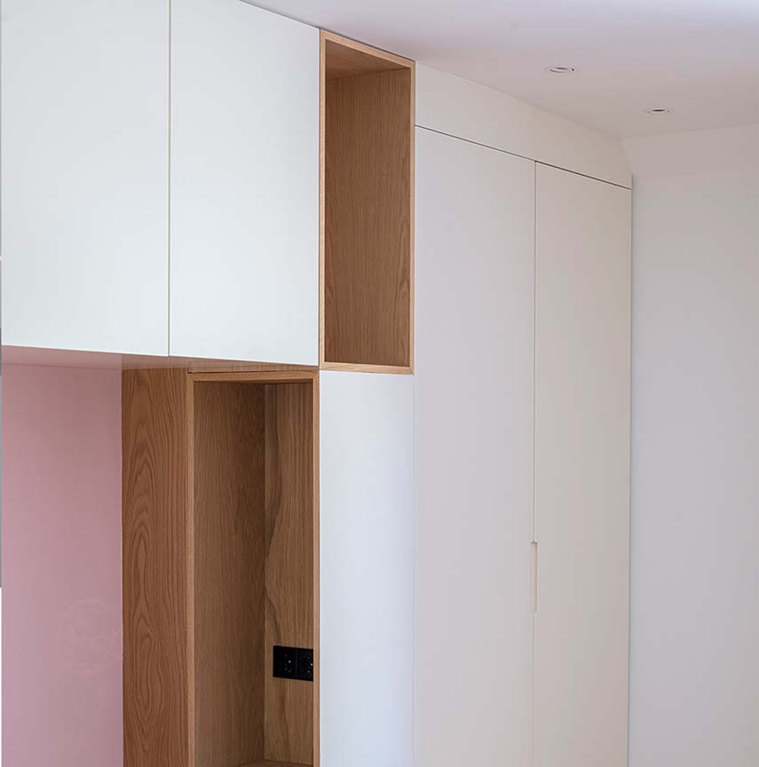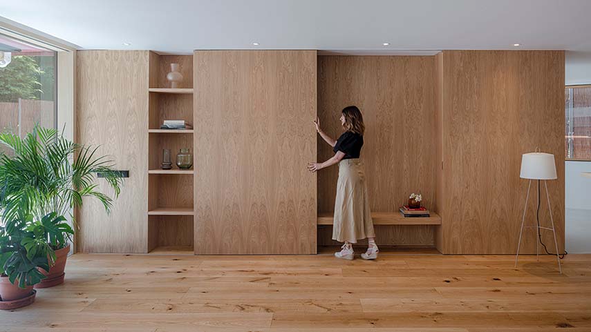 Avec ce nouveau concept d'espace de vie, plus fluide et moins séparé, un duo de matériaux très clair et rigoureux est utilisé pour les intérieurs de Casa Nogal: bois de chêne et blanc. Avec ces deux matériaux, tous les espaces sont modelés, répondant aux besoins de chacun: par exemple, le rangement, les sièges, les surfaces de support, etc. L'utilisation réduite et minimaliste de textures et de couleurs crée des espaces calmes, sereins, qui aboutissent à un langage harmonieux dans tous les environnements de la maison