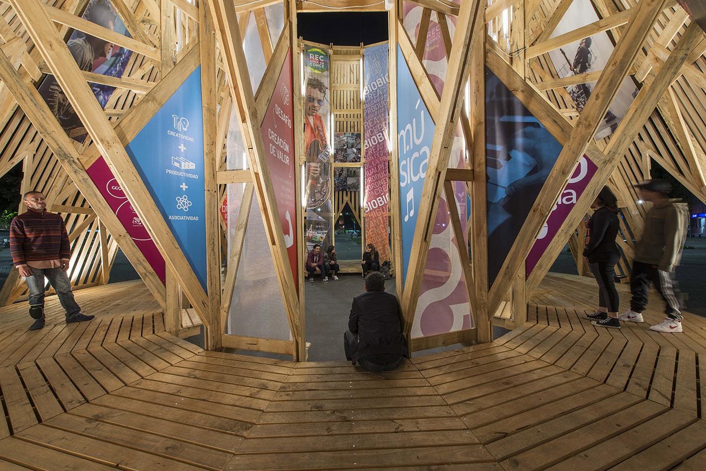 The pavilion has an oval floor plan, is made entirely of wood and is open to the sky in the center. The temporary wooden construction, installed in the city's busiest center, certainly arouses a lot of curiosity in passers-by, who try to give different interpretations to the presence of the foreign object, from the image of an upside-down loudspeaker to that of a resting hut, an echo of the vernacular building of the Mapuche people in southern Chile