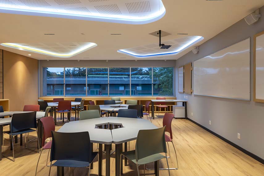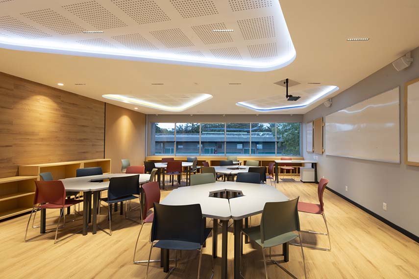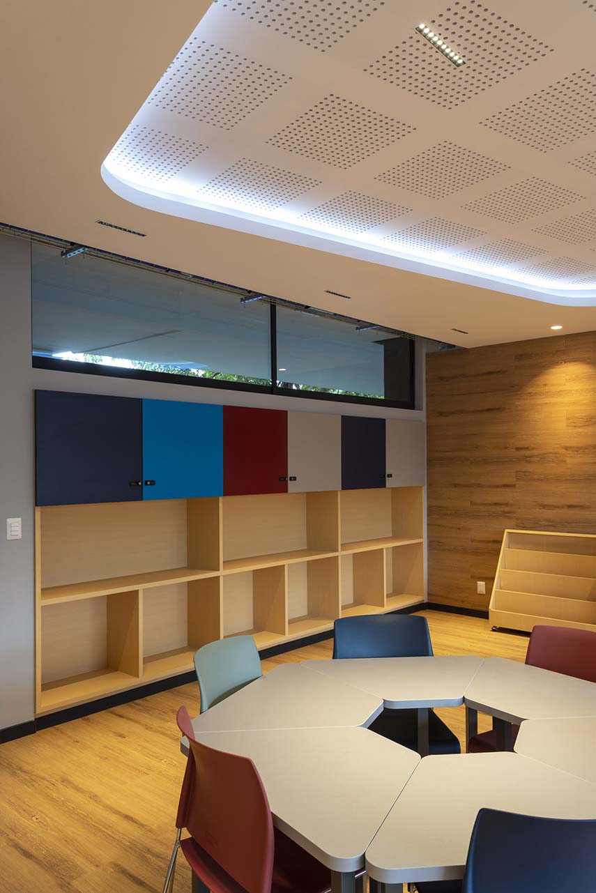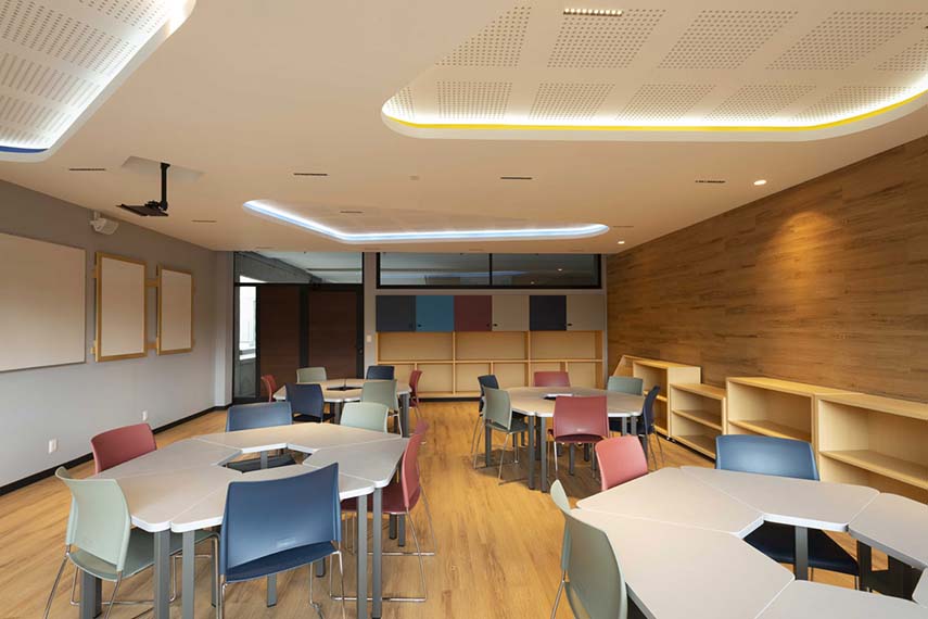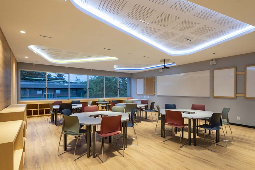 Quelques touches de couleur sur les casiers pour les sacs à dos et le matériel des étudiants, ainsi que sur les chaises, ajoutent une touche de gaieté. Les salles de classe sont équipées de luminaires acoustiques dans lesquels est installé le système d'éclairage qui combine des appareils indirects et directs, pour avoir un environnement correctement éclairé pour chaque activité. Comme il s'agit d'espaces de formation pour les jeunes du 21ème siècle, le niveau de connectivité est maximal : internet haut débit, audio et vidéo