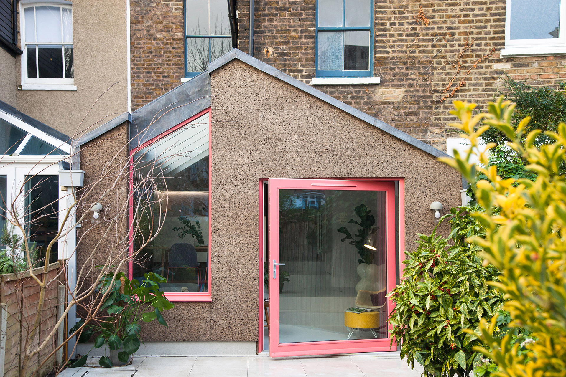 A large hinged door and a slit window frame the view of the garden. The pink colour of the windows creates an interesting contrast with the cork. Inside, the colours and shades are warm. A pale grey resin provides a finish to the horizontal and vertical surfaces, creating a continuous surface