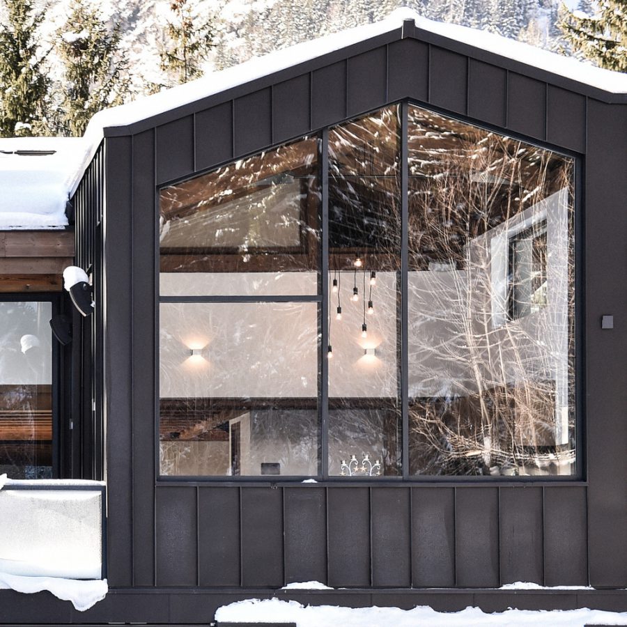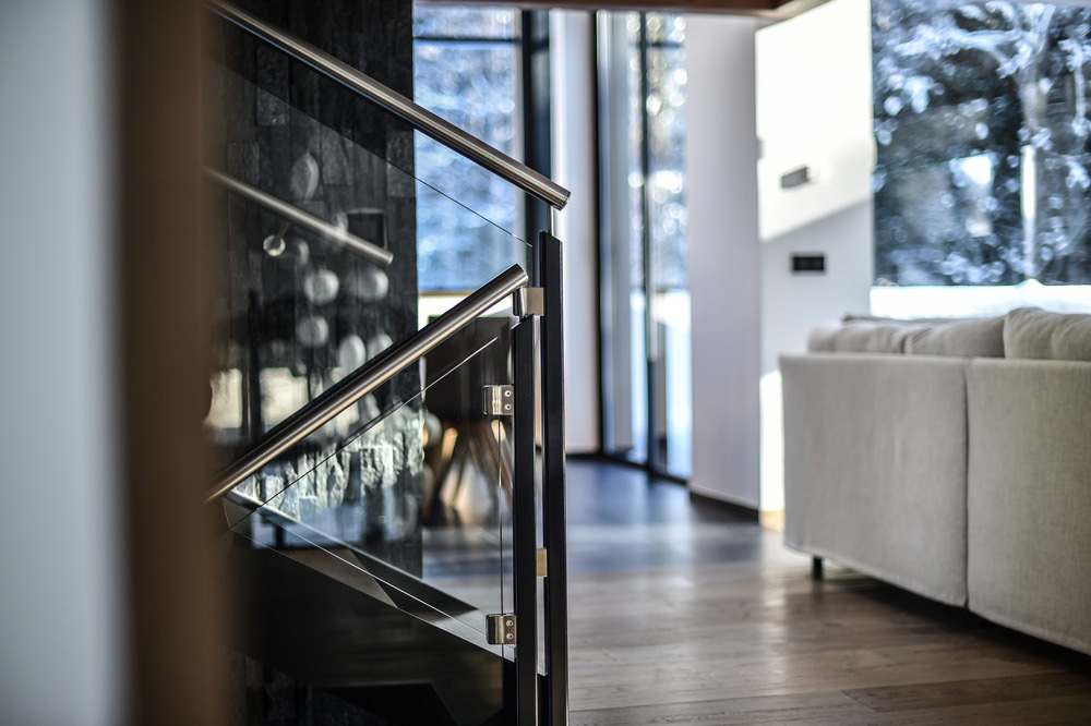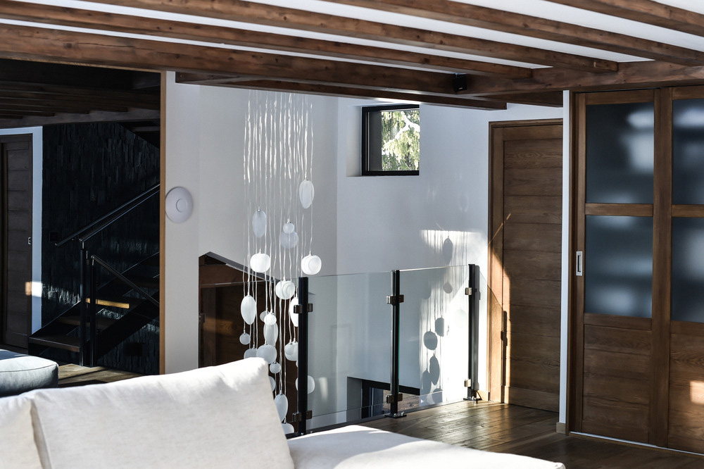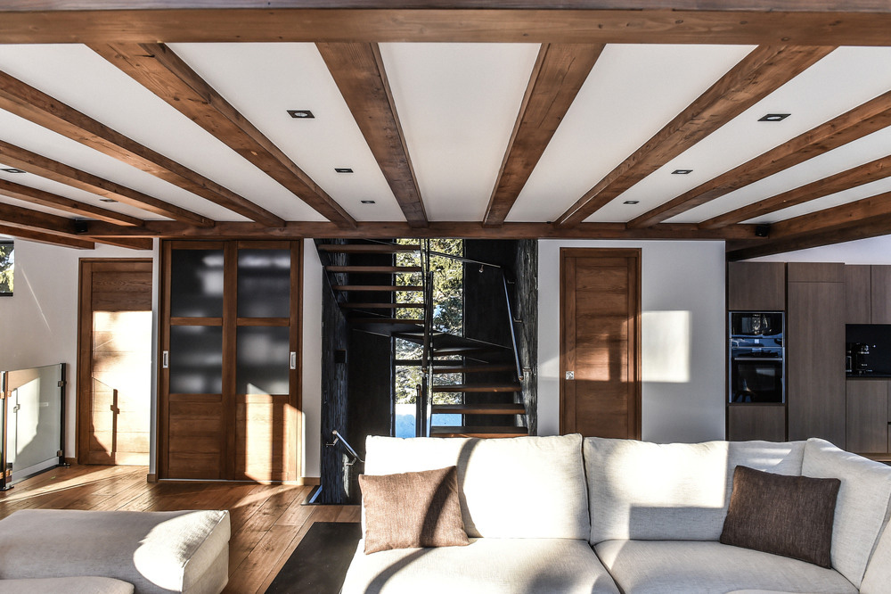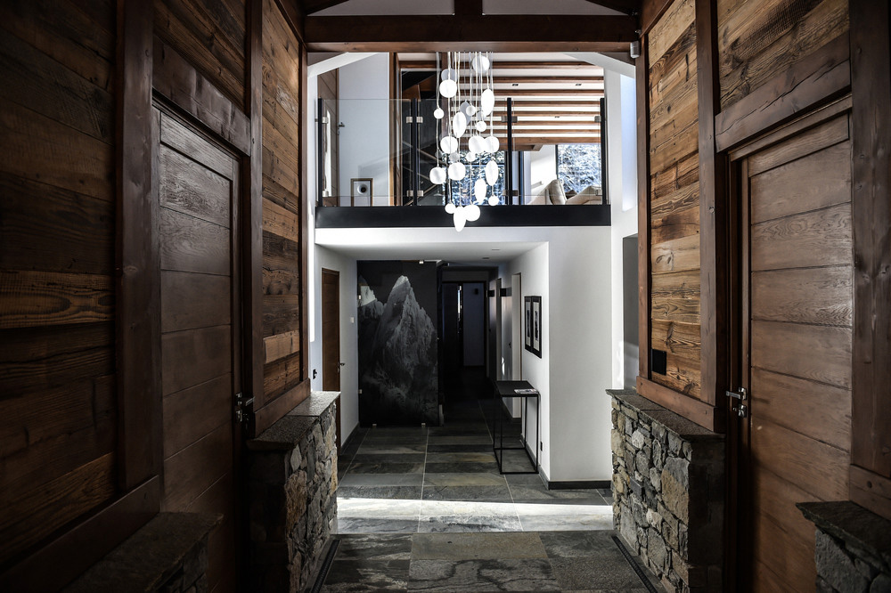 La mezzanine suspendue au-dessus du salon est un exemple de solution conçue pour satisfaire l'un des désirs du propriétaire, sans compromettre la vue sur les montagnes des Aiguilles de Chamonix. Dans le même esprit, l'architecte a voulu qu'il soit possible de voir l'Aiguille Verte et les Drus depuis la cuisine ou même depuis la piscine au sous-sol. Par conséquent, l'un des murs de la cuisine est équipé d'un panneau en verre donnant sur le Couloir Whymper, tandis que la piscine dispose d'une fenêtre offrant des vues spectaculaires.