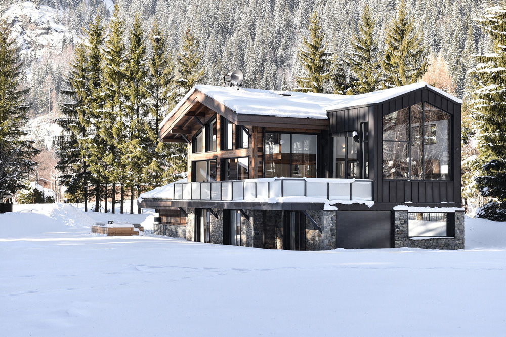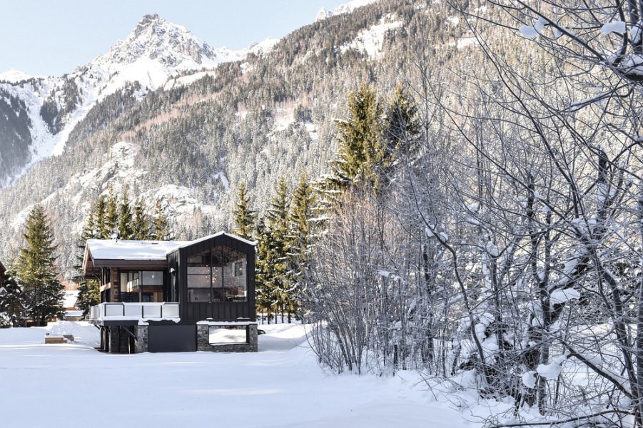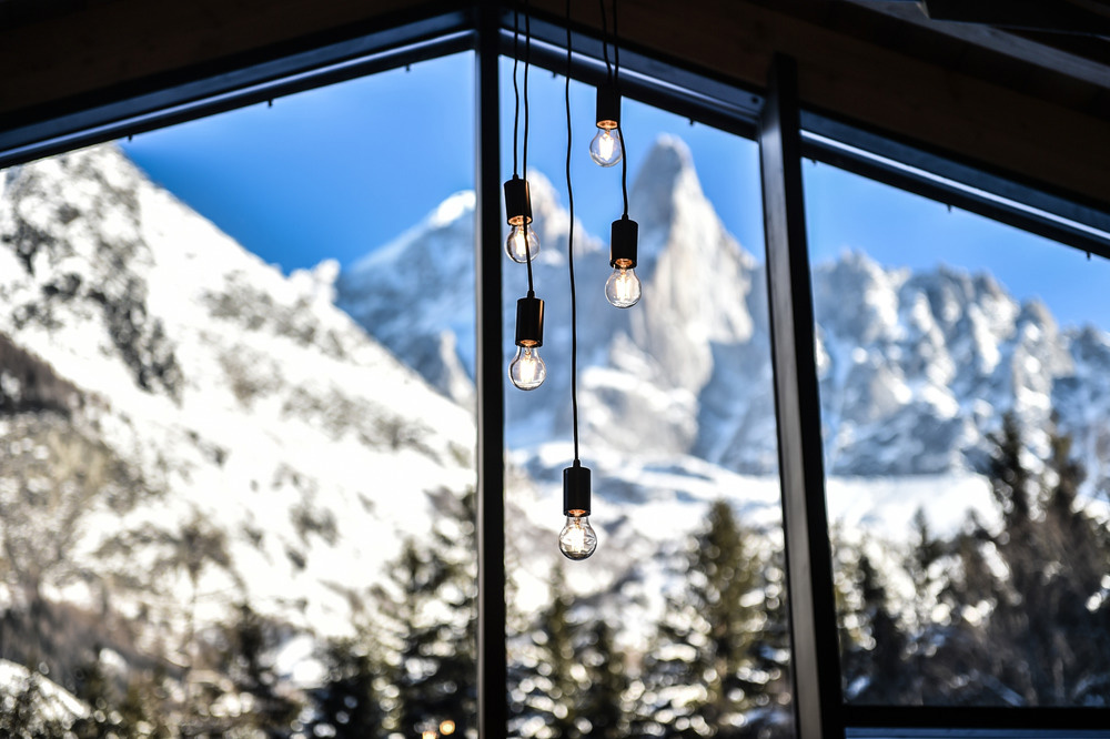 Travaillant au cœur d'un grand espace vert inévitable, les architectes Chevallier ont pu positionner le chalet au bon endroit, offrant une vue spectaculaire sur trois sommets emblématiques, les deux Drus et l'Aiguille Verte.