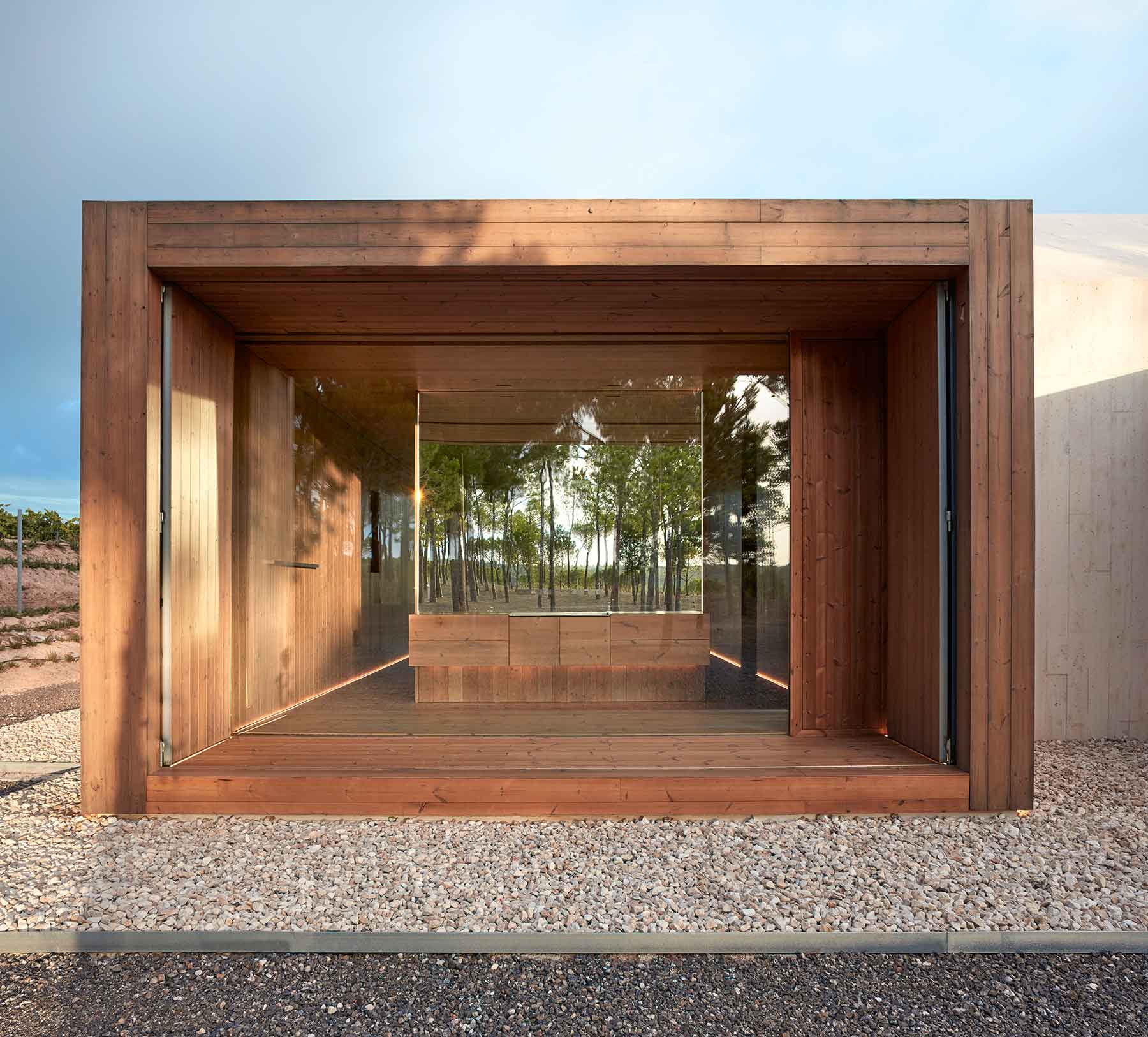 The project is therefore characterized by two monolithic structures: the first made of white cement, the second made of pine wood, with thermally modified surfaces