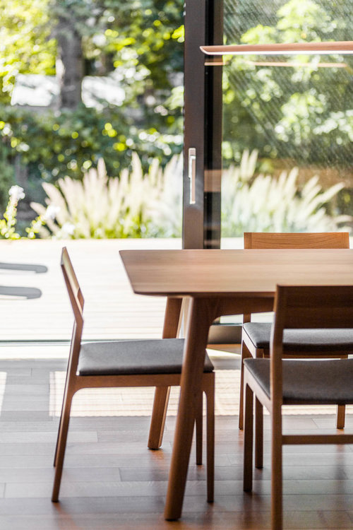 Part of the masonry rear wall is removed and a steel support beam added. The metalworking now forms a canopy above the terrace covered with red cedar. Above the large opening, the two windows in each of the children's bedrooms on the first floor were replaced with a window