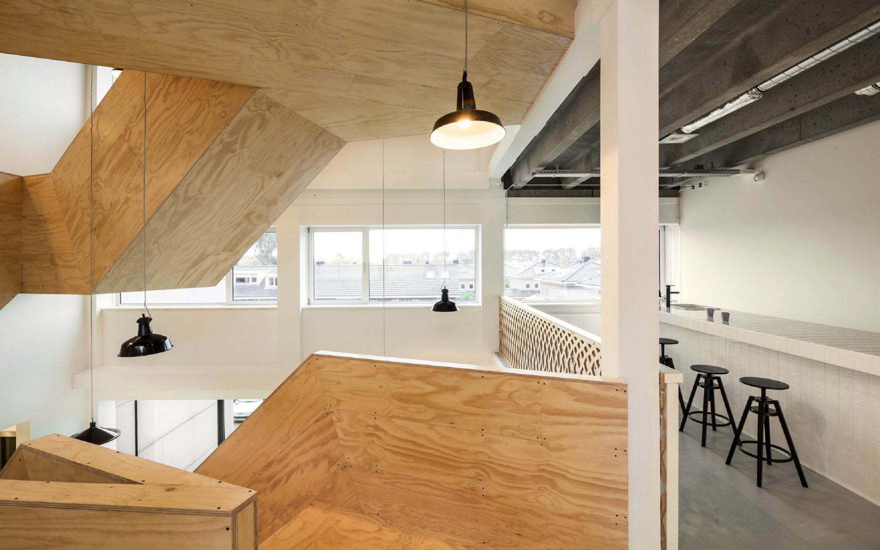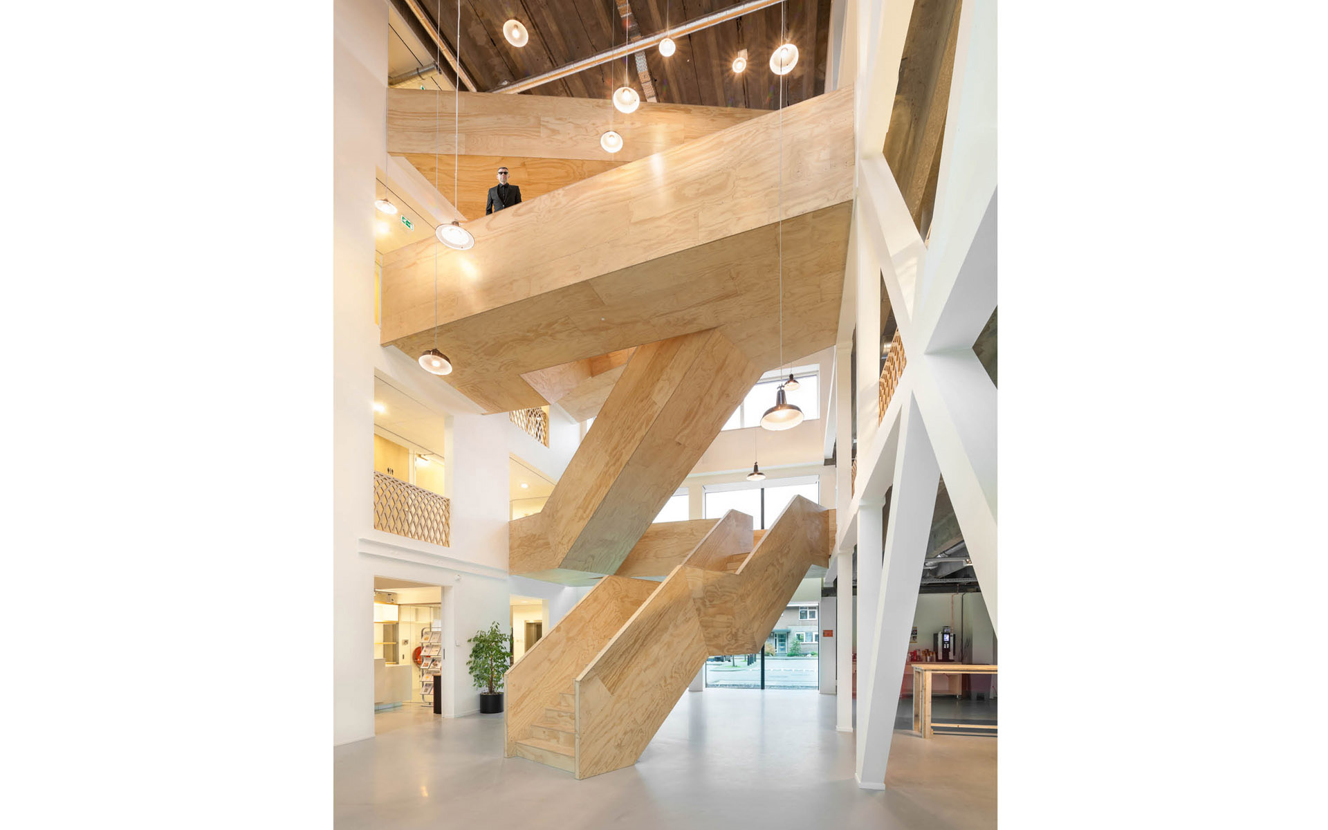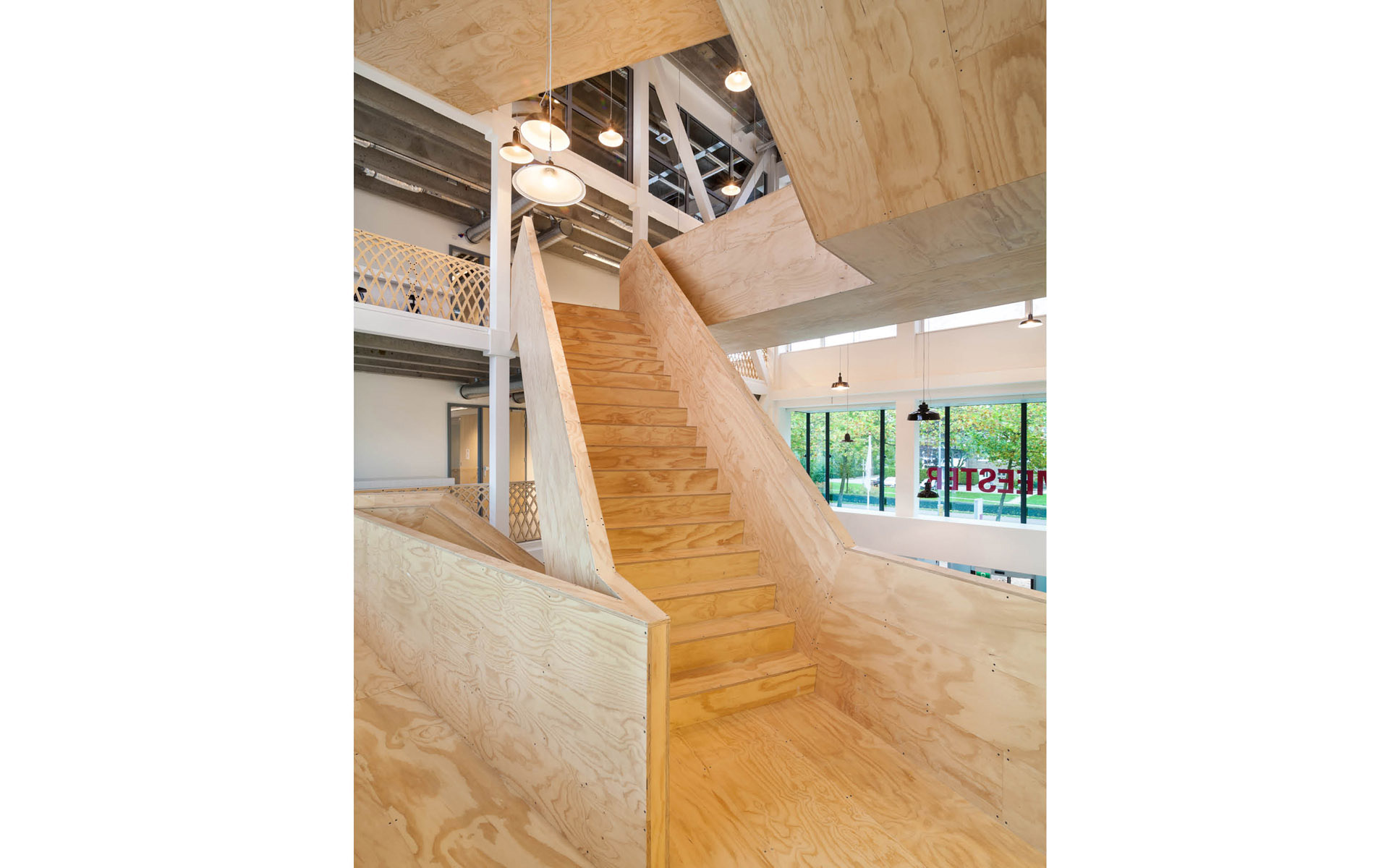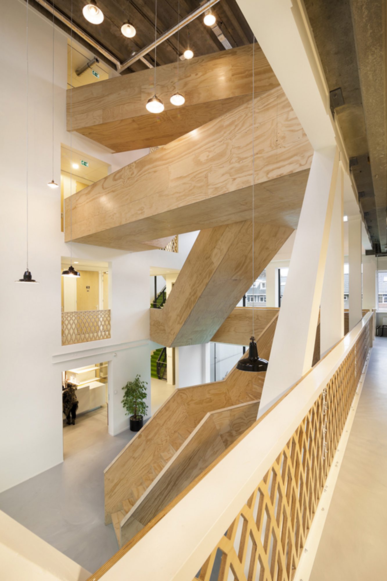 Les concepteurs ont pu maximiser les qualités que le bâtiment possédait déjà : une vue sur le quartier environnant et la lumière du jour. L'ouverture et la transparence obtenues grâce à l'ajout de murs en verre et de l'atrium garantissent une vue sur l'extérieur. Les faux plafonds ont été enlevés pour révéler le sol en béton authentique avec les poutres. La structure horizontale de support nue définit l'atmosphère. Les escaliers et les garde-corps en bois revêtus ajoutent de la chaleur. L'escalier est en acier revêtu de simples feuilles de contreplaqué verni transparent.
