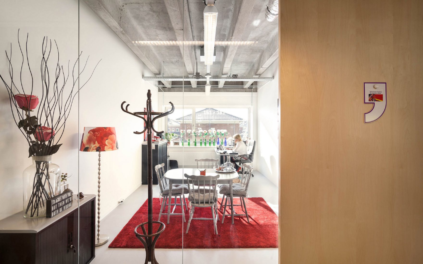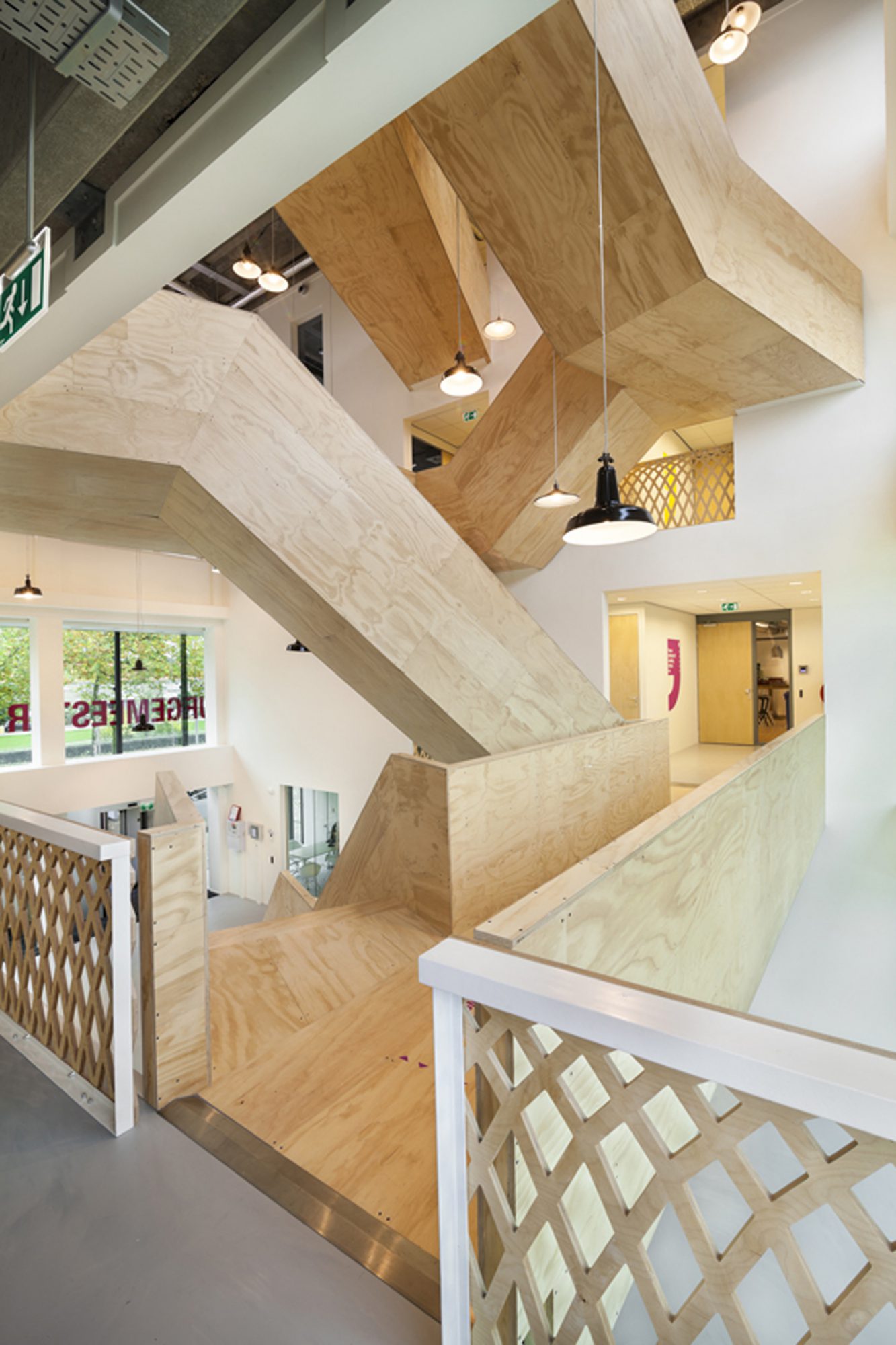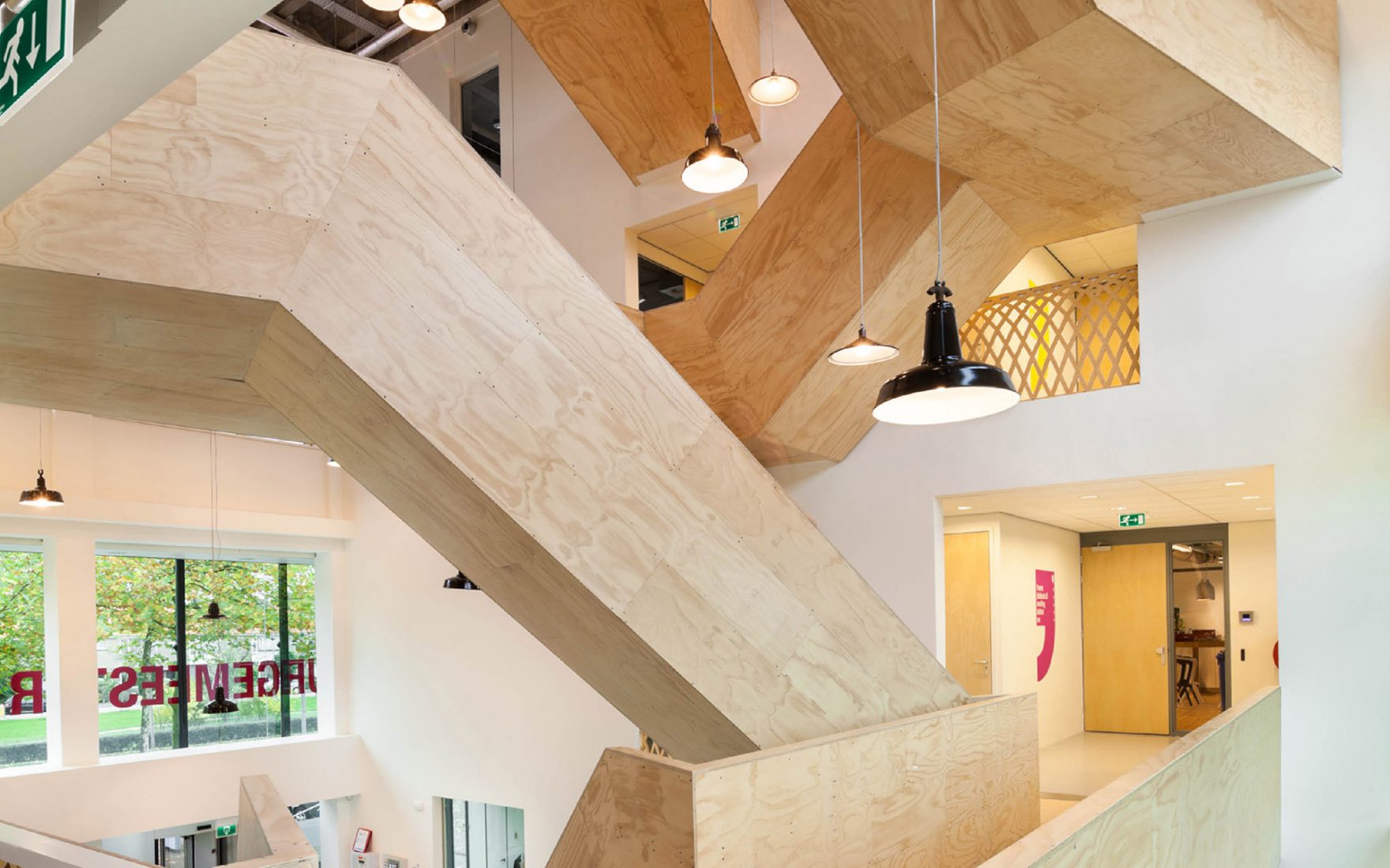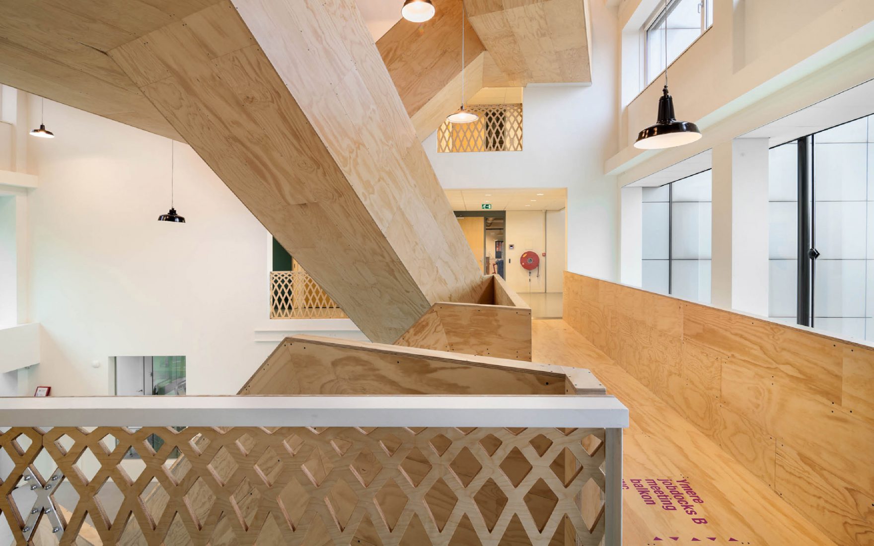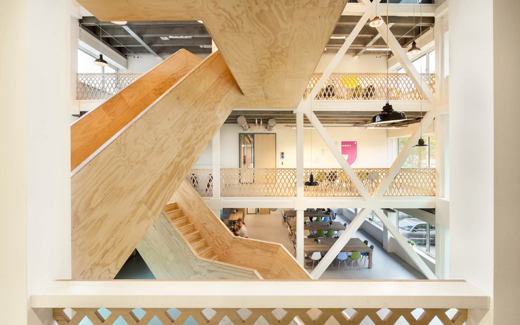 Les concepteurs ont pu maximiser les qualités que le bâtiment possédait déjà : une vue sur le quartier environnant et la lumière du jour. L'ouverture et la transparence obtenues grâce à l'ajout de murs en verre et de l'atrium garantissent une vue sur l'extérieur. Les faux plafonds ont été enlevés pour révéler le sol en béton authentique avec les poutres. La structure horizontale de support nue définit l'atmosphère. Les escaliers et les garde-corps en bois revêtus ajoutent de la chaleur. L'escalier est en acier revêtu de simples feuilles de contreplaqué verni transparent.