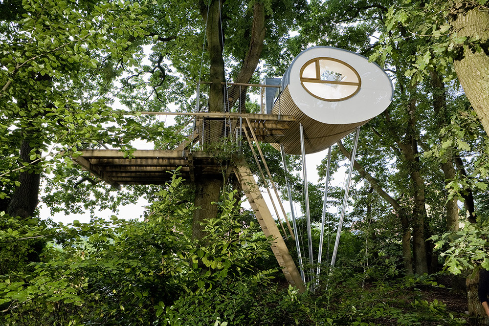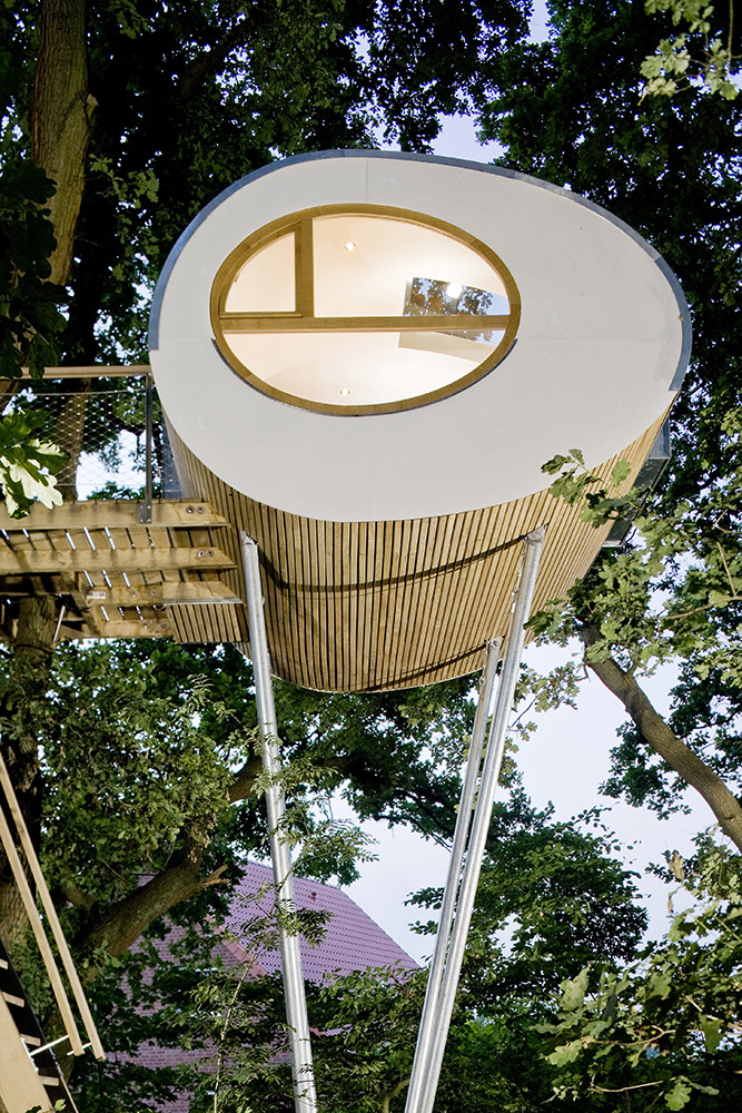 La maison dans les arbres en Basse-Saxe est un témoignage de la capacité du cabinet Baumraum à relever les défis de conception, à travers des solutions créatives, durables et profondément respectueuses du contexte naturel et humain dans lequel elles s'insèrent. La forme de l'habitation, inspirée d'un œuf coupé longitudinalement, s'intègre harmonieusement avec l'environnement environnant, grâce également à sa peinture crème et à ses fenêtres elliptiques. Le choix de matériaux robustes et locaux, tels que le chêne indigène pour l'extérieur, souligne l'engagement envers la durabilité et la longévité. Un détail qui attire l'attention est le verre courbé utilisé sur la façade avant, ajoutant une touche de modernité incomparable.