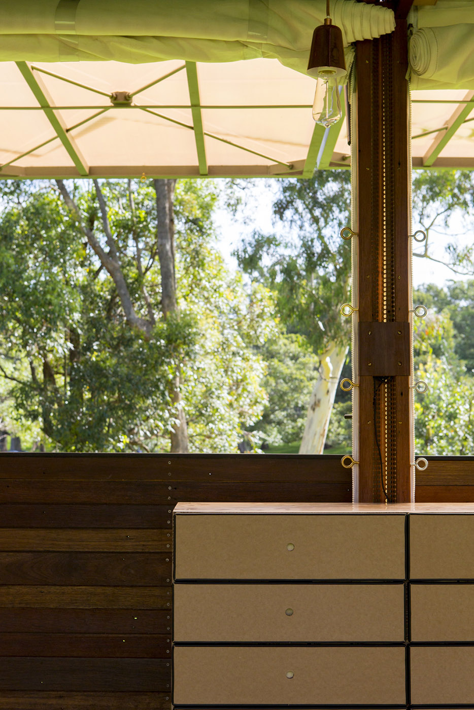 Designed by Alexander Symes Architect and constructed from predominantly recycled materials, the open-plan interior facilitates the retail experience with awnings that enable the store to respond to climate, site conditions and views of the surrounding landscapes