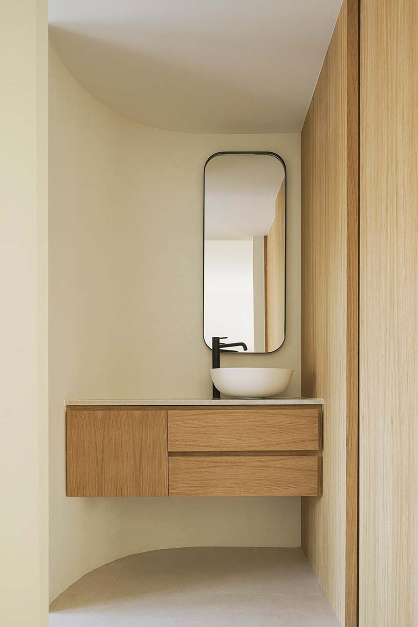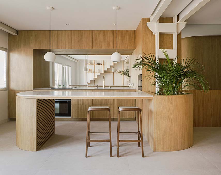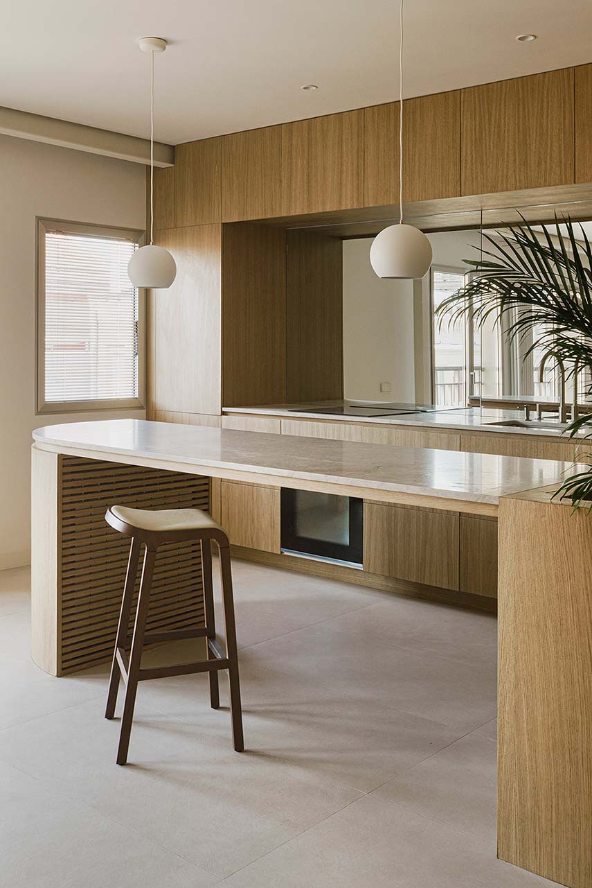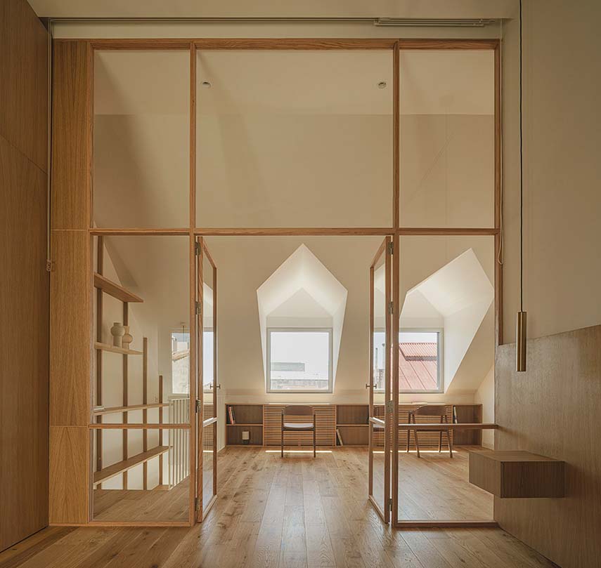 Les textures du bois des éléments verticaux et la céramique du sol donnent à l'espace un caractère unique et un fil conducteur dans le langage diversifié des plans. Les volumes de menuiserie en chêne articulent les espaces de jour et cachent les zones nocturnes, plus privées. Utilisés comme filtre, ils confèrent une continuité spatiale et matérielle au logement