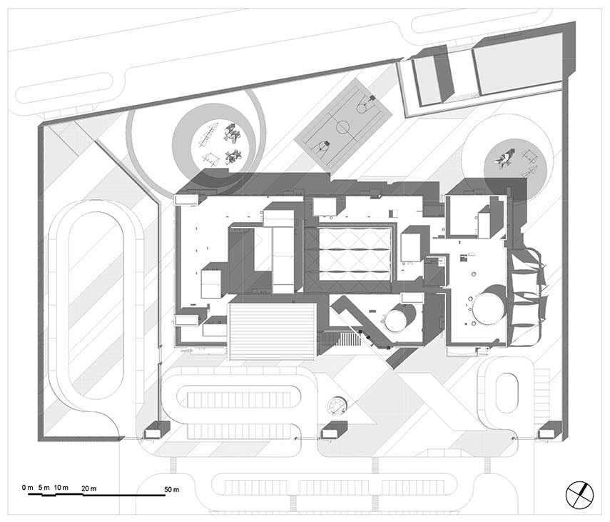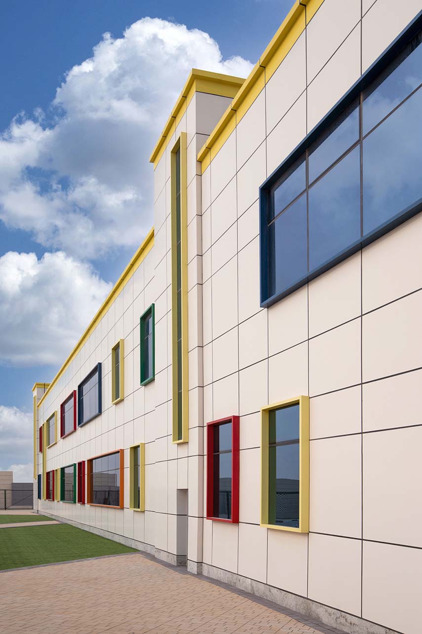 Un complexe scolaire conçu pour accueillir des filles dans la petite localité d'Al-Laseeli, au sud de Dubaï. Le projet, signé par le Groupe UPA, se distingue par le fait d'être le premier bâtiment public conçu en BIM aux Émirats arabes unis. La rigidité du module de 1,5 mètre se traduit par un système architectural ludique, composé de volumes blancs, de géométries colorées et de cours comme espaces centraux de la vie scolaire. Le module de 1,5 mètre, contrainte imposée par le Ministère des Infrastructures et du Développement, devient la base d'un langage architectural ludique. Les façades blanches en aluminium transforment l'ensemble du bâtiment en une sorte de grand cahier à carreaux. Les cadres colorés des fenêtres, qui se détachent du plan de façade, rompent la rigidité compositionnelle, suggérant un jeu de formes conçu pour stimuler la perception et la curiosité des plus jeunes.
