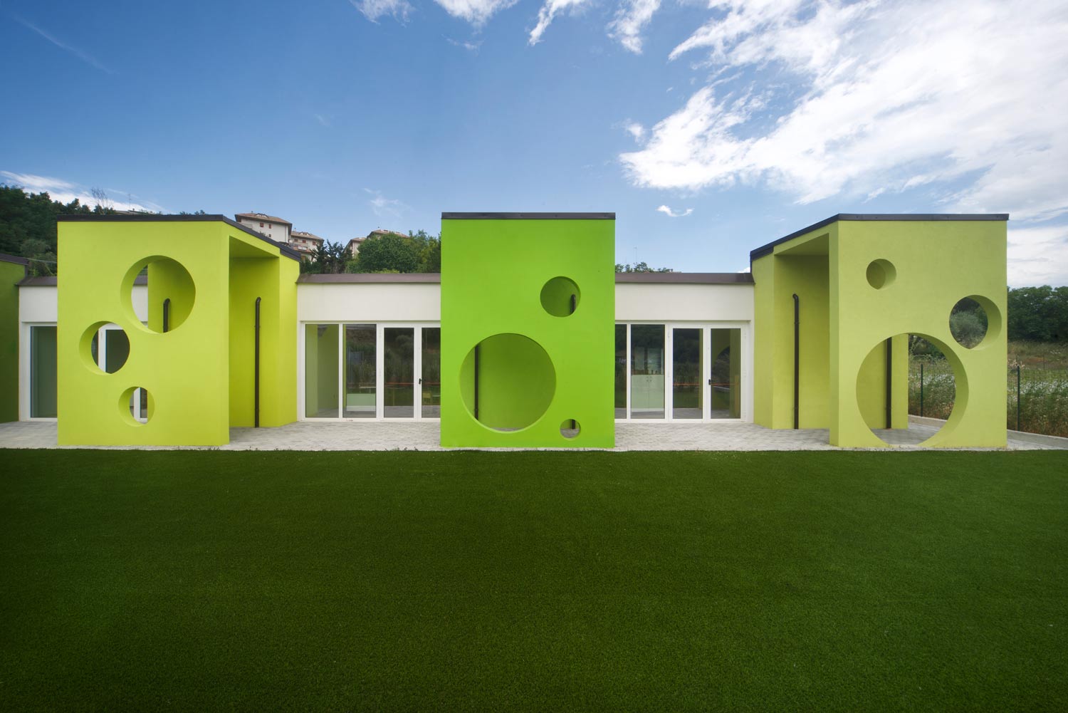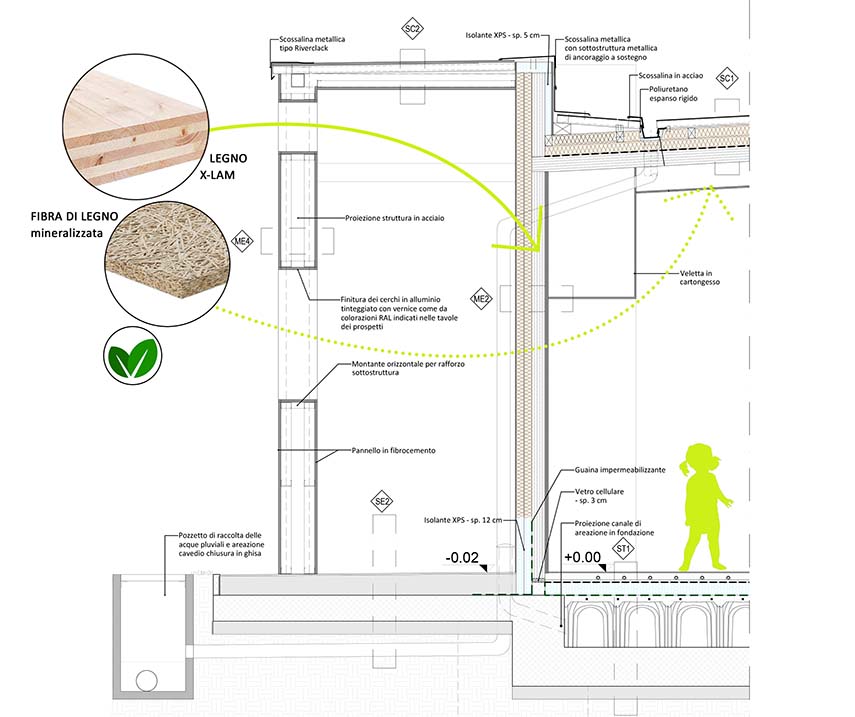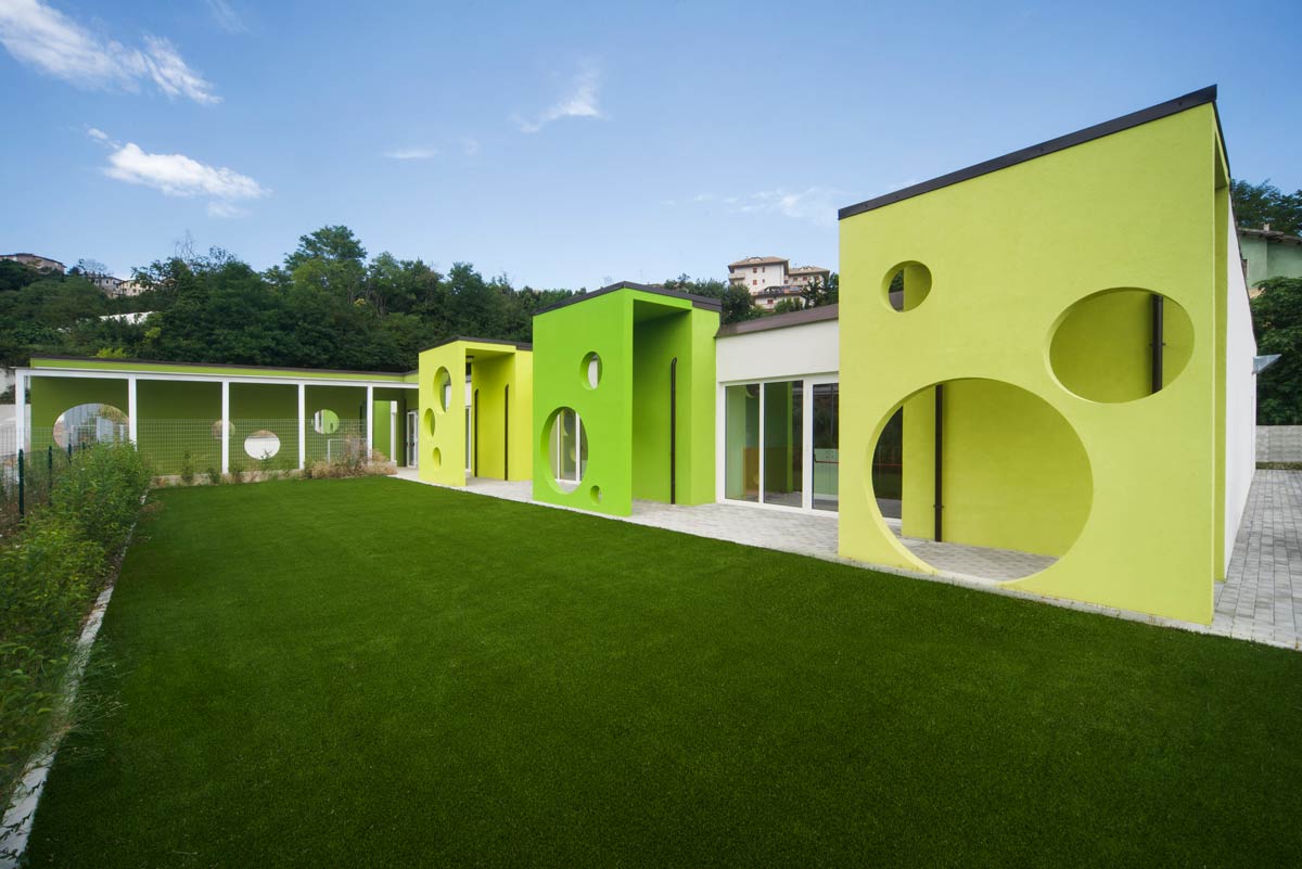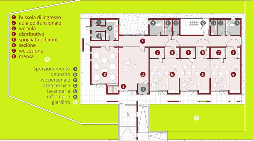 La nouvelle École maternelle est située à côté de l'École primaire récemment construite, dans une zone en expansion urbaine au sud du centre de Folignano. Le terrain présentait une forte pente, avec des inclinaisons entre 10% et 30%, et le projet visait à s'intégrer dans le paysage environnant. L'intervention, d'environ 548 m² et 1 905 m³, s'est concentrée sur la création d'un volume unique, positionné stratégiquement dans l'aile Est du terrain pour équilibrer les déblais et les remblais nécessaires.