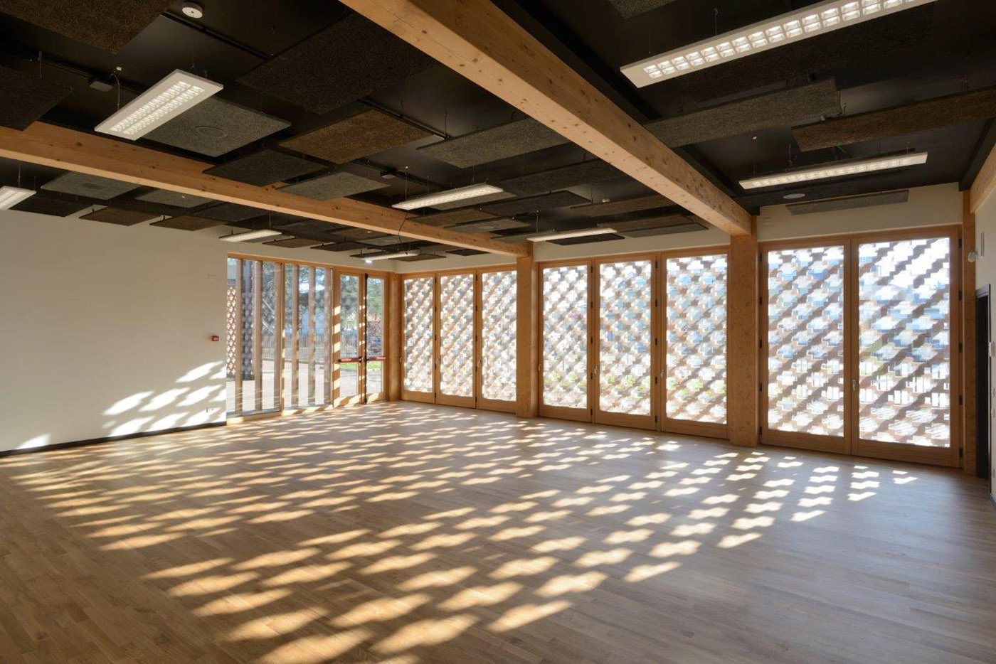 Polo scolastico con struttura in legno. Un edificio sostenibile con tetto verde per insegnare l’ecologia