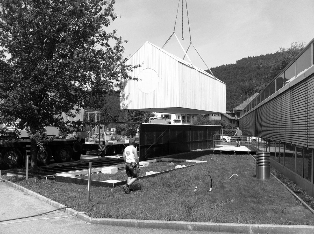 The project was conceived as an Exhibition House for the wood construction company Kaspar Greber and its commercial partners, to present "wood" in a different way, in order to let potential customers and visitors experience the product and its construction firsthand, by touching, smelling and feeling it