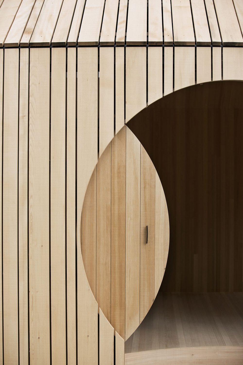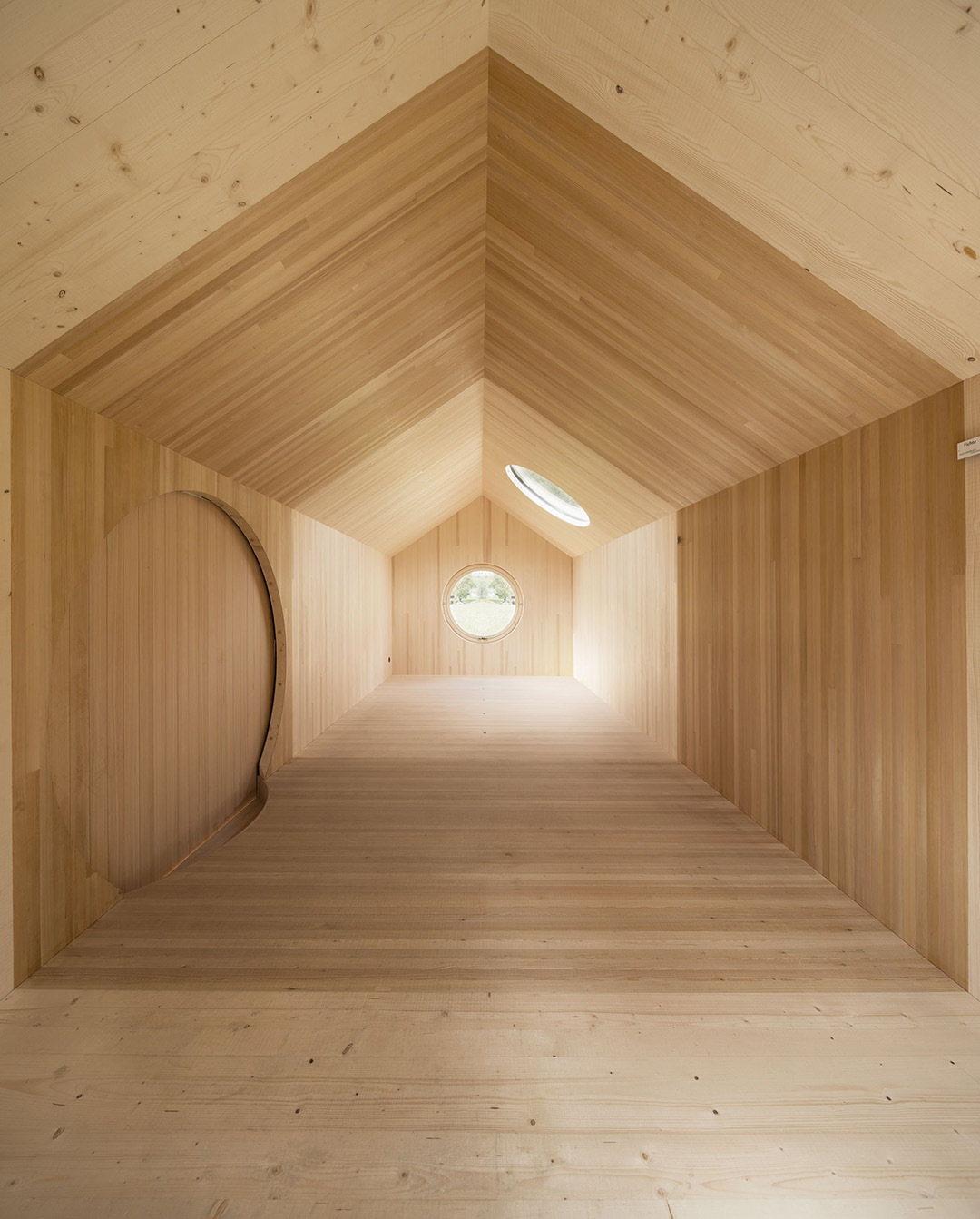 The structures of walls and ceilings are represented proportionally and their construction and assembly is visible from close up in the openings. The doors and windows are round to invite visitors to take a closer look. In addition, wall, ceiling and floor connections can be seen thanks to the pavilion's staircase system