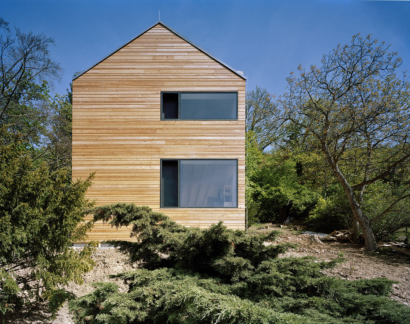 Le terrain où se trouve la maison est celui le plus proche de la forêt, offrant une vue dégagée sur la vallée de la rivière Berounka. La demande des clients était d'avoir un abri pour une famille avec trois enfants. Il y a un bloc de services avec un couloir, une salle de bain et une pièce technique à l'entrée, entouré d'un espace de vie avec une salle d'étude