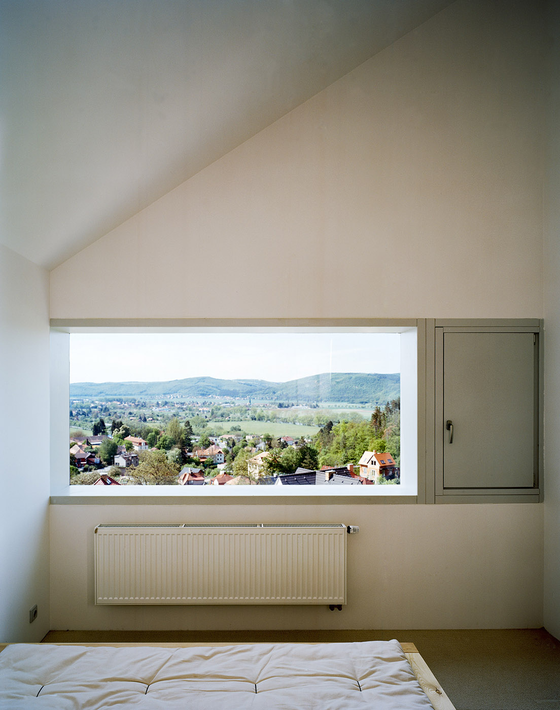 Au dernier étage se trouve la partie la plus privée de la maison. Le toit à double pente est en harmonie avec le style des maisons environnantes, même s'il diffère d'elles en termes de matériaux. Grâce à la structure en bois, la construction sur un terrain en pente a été beaucoup plus facile
