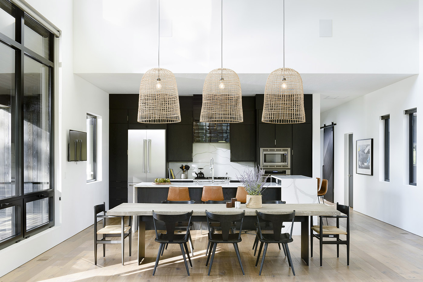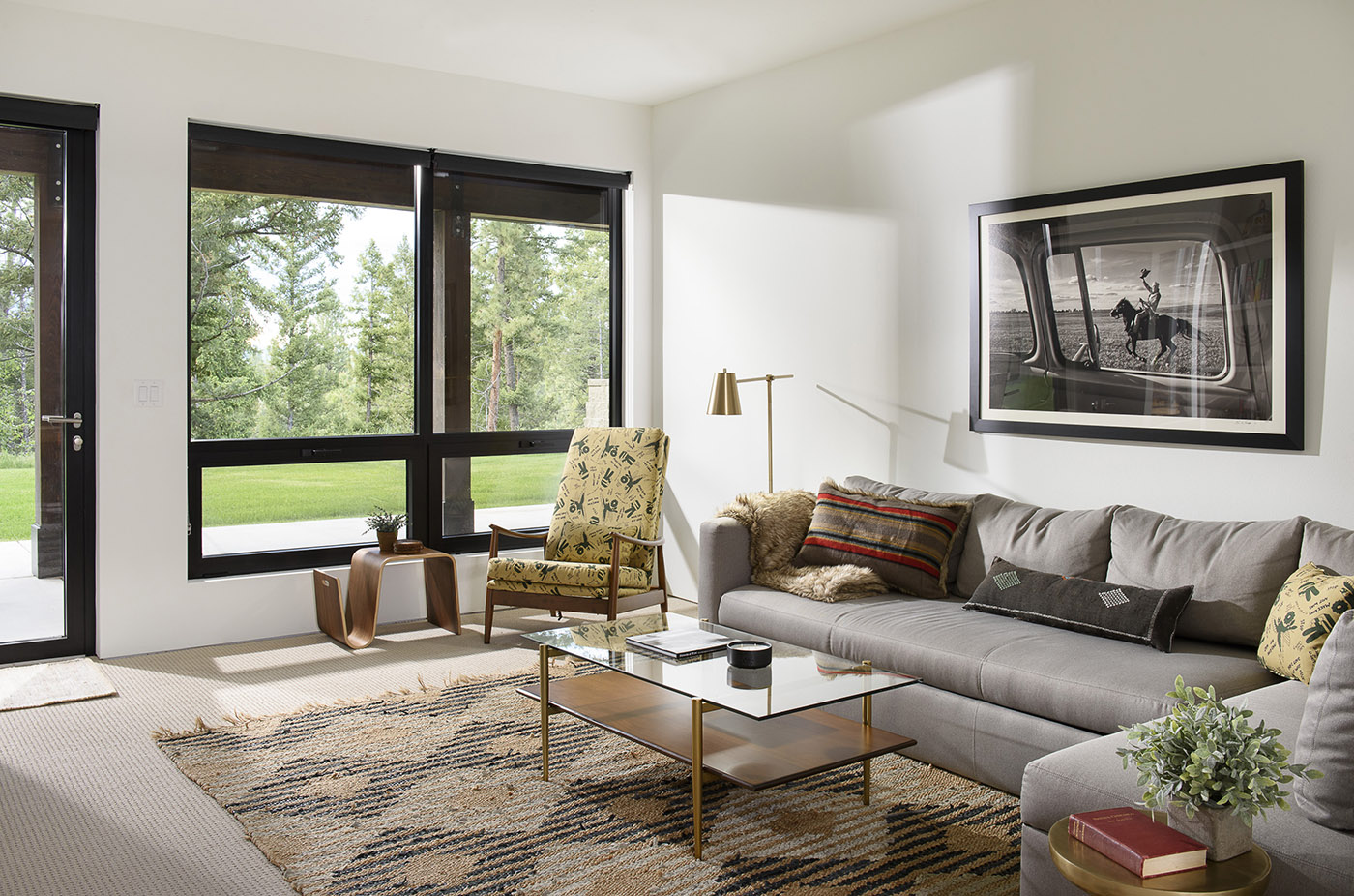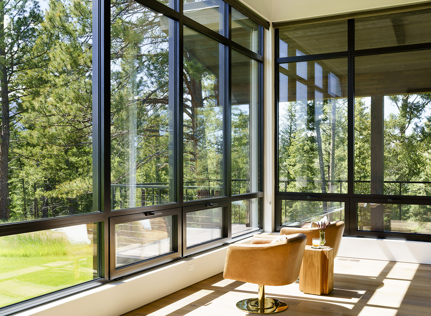 The living spaces are oriented toward the view of Trapper Peak: no matter where you are in the house,you will always have a view of the mountain framed by the large windows. The house was intentionally designed to appear minimal in the front and blend in with the tree line, while the back is expansive with extensively glazed walls that create a treehouse feel
