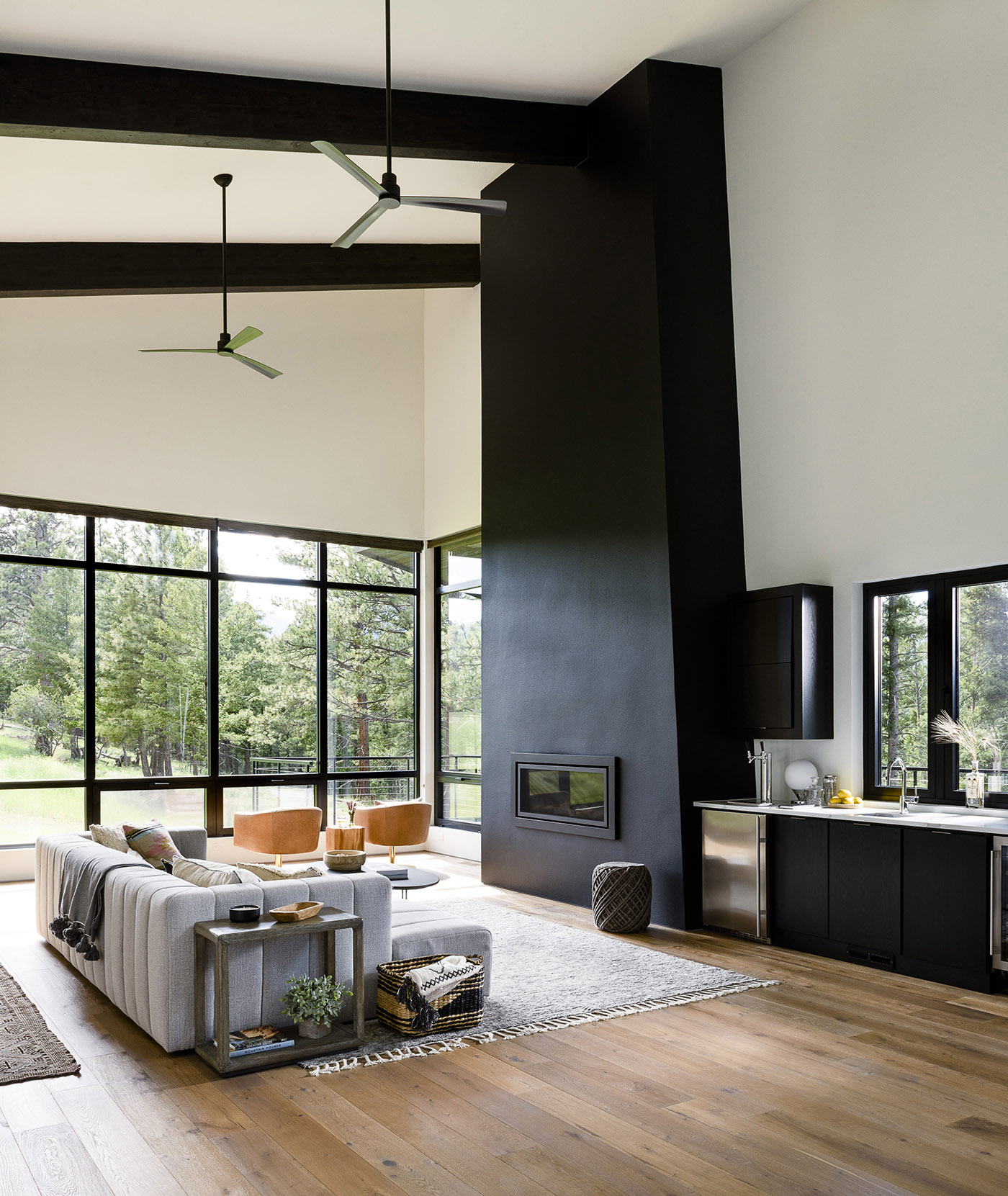 The goal was to design an intimate home of a size just right for the family's lifestyle. Double-height volumes and windows overlooking trees and mountains give the feeling of a much larger space. Although the Fat Deer Lodge has hints of a mountain aesthetic, such as rough-hewn beams made of reclaimed wood, it actually has a modern soul. The externally wood-clad home uses a simple material palette, white oak floors and high ceilings anchored by a floor-to-ceiling fireplace create a bright, open space