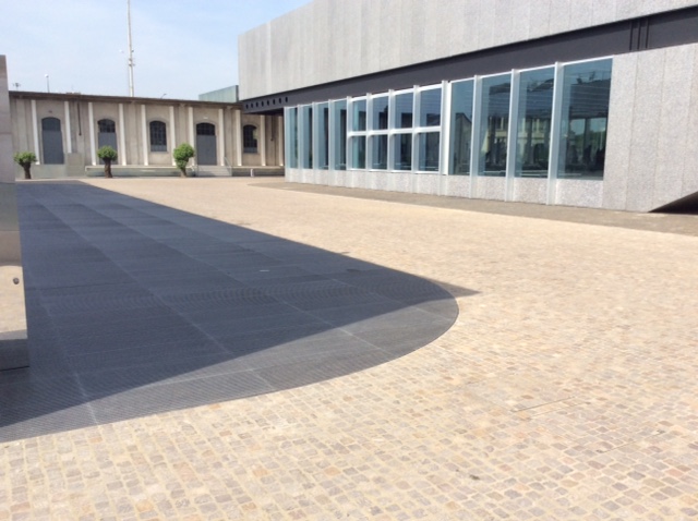A completamento del sistema di drenaggio sono state poi utilizzate, come elementi superiori a vista, delle caditoie a fessura in acciaio inox AISI 430, realizzate su misura per rispondere alle diverse esigenze tecniche legate alla struttura e alla composizione della pavimentazione della Fondazione Prada. Per le parti curvilinee è stata utilizzata una tipologia di canale completamente realizzate in acciaio inox con il metodo della “calandra”, AISI 430 con la parte a vista della stessa tipologia della caditoia a fessura, per seguire e delimitare i differenti tipi di pavimentazione delle parti curvilinee. Inoltre, per il trattamento delle acque di scarico dei punti di ristoro della Fondazione è stato utilizzato il separatore di grassi ACO Hydrojet estensione 3, realizzato in polietilene rinforzato e con connessione per smaltimento con aspirazione diretto e sistema autopulente idromeccanico automatizzato, il tutto senza alcuna emissione di odori.