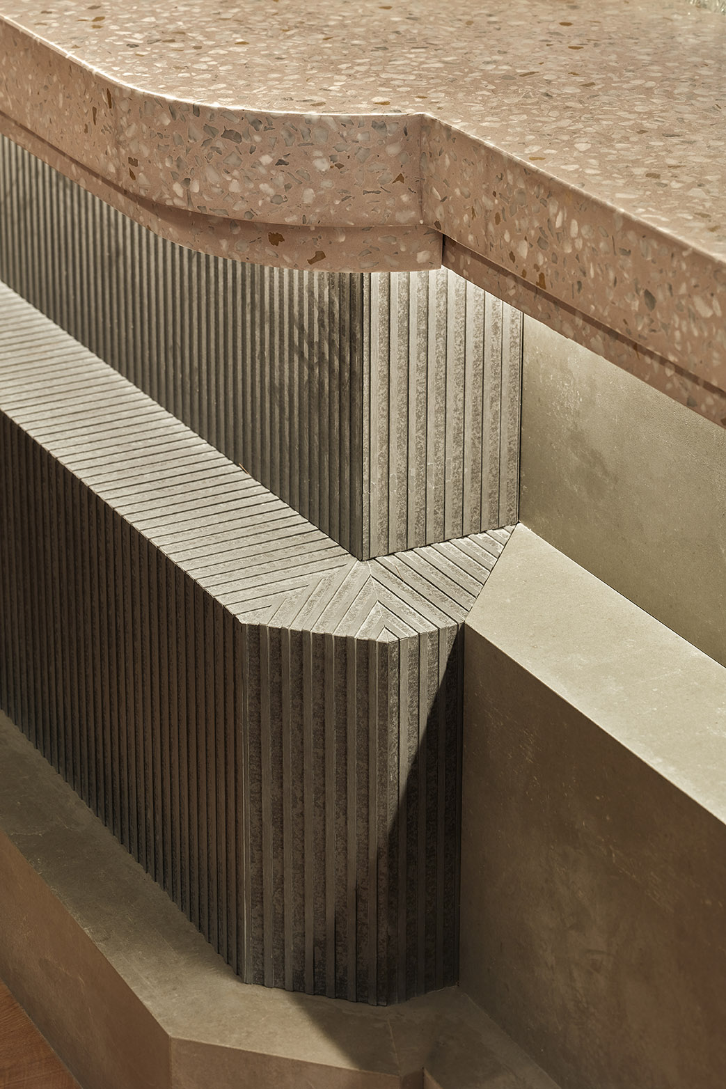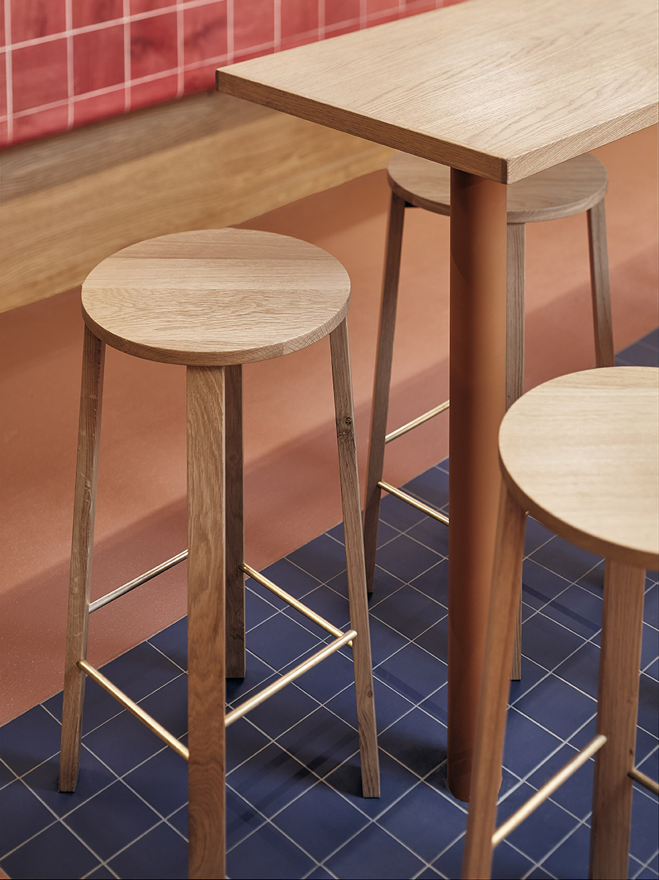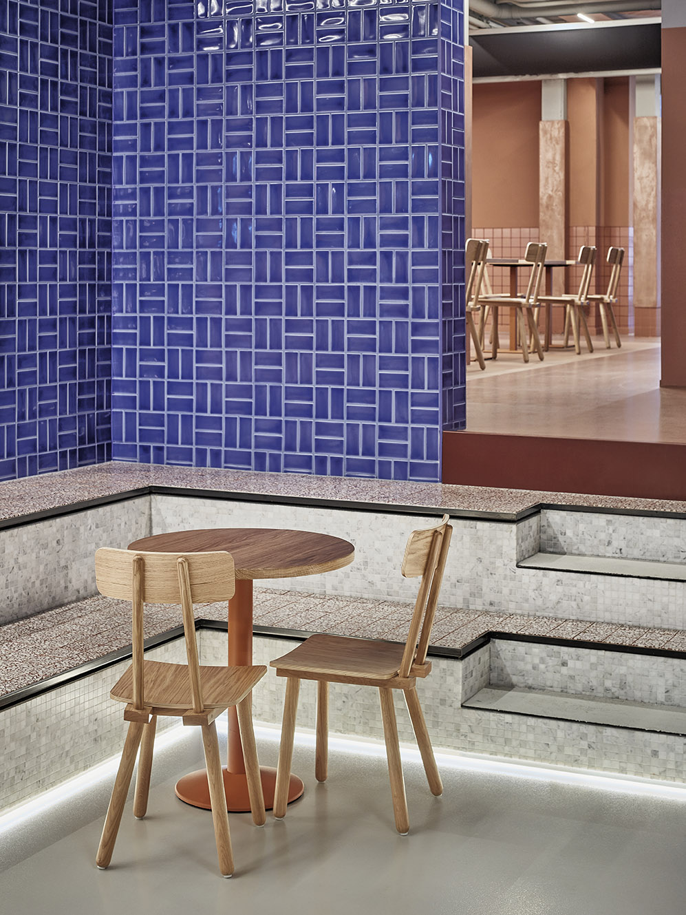 Another structural element that has been reinvented as a social place is a large staircase, made of wood and mosaic tiles, which is visible from various points within the space and encourages people to explore the bar upstairs. Every nook and cranny of the space has been carefully designed, offering endless possibilities for encounters.
