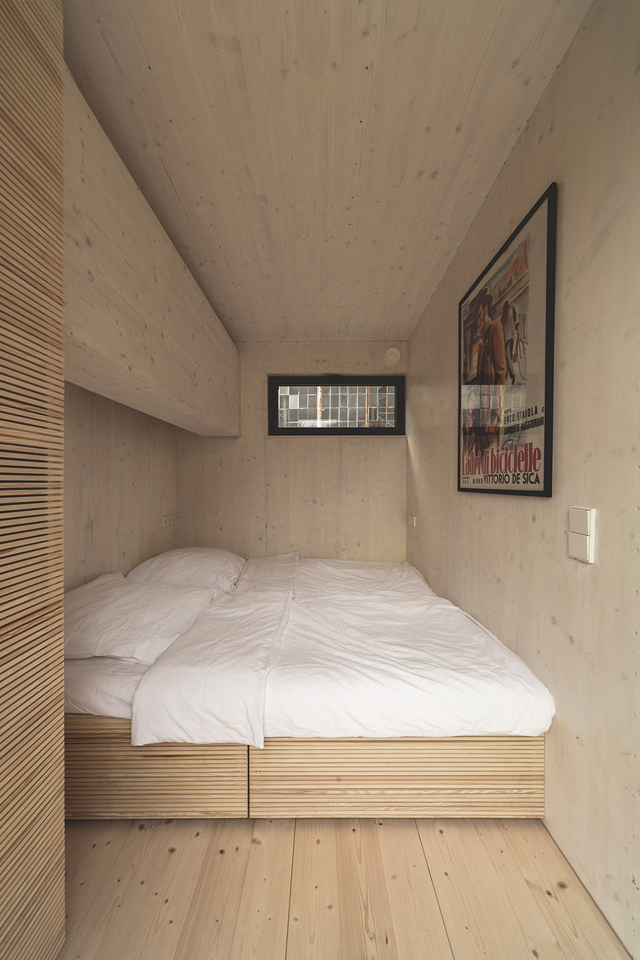 Thanks to the small number of materials used, continuity is created in the interior space. The house is built with natural and ecological materials, such as wood fibre insulation, triple-layer wood panels, boiled linseed oil-based paint